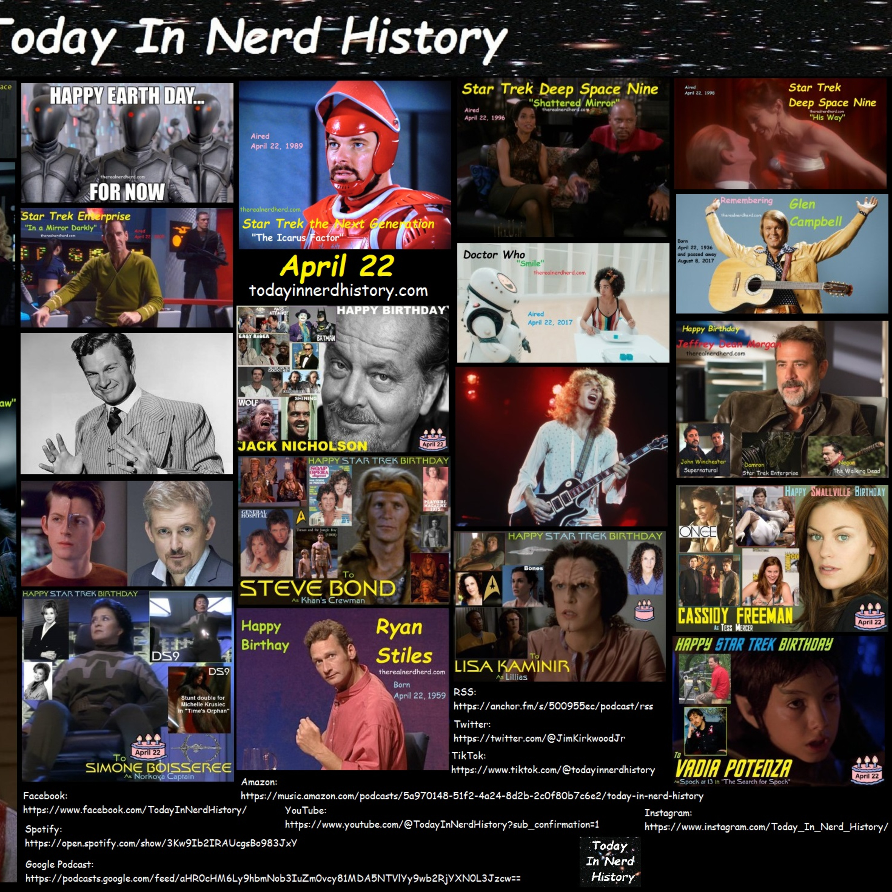 . #TodayInNerdHistory #April22 #EarthDay #StarTrek #StarTrekTheNextGeneration #TheIcarusFactor #StarTrekDeepSpaceNine #ShatteredMirror #HisWay #StarTrekVoyager #Unforgettable #StarTrekEnterprise #InAMirrorDarkly #DoctorWho #ToothAndClaw #Smile #GlenCampbell #EddieAlbert #JackNicholson #PeterFrampton #JeffreyDeanMorgan #RyanStiles #ManuIntiraymi #SteveBond #CassidyFreeman #VadiaPotenza #KenOlandt #Birthday #podcast #video #TheRealNerdHerd #TheNerdHerd #Nerdherd #Nerd