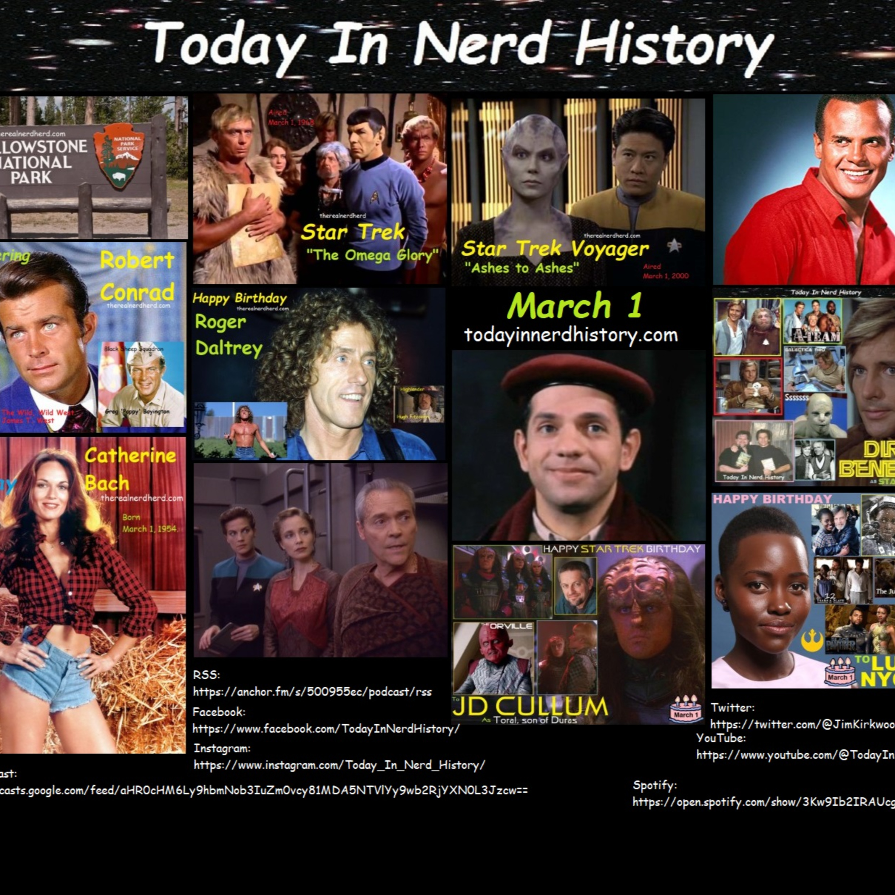. #Yellowstone #NationalPark #StarTrek #TheOmegaGlory #StarTrekVoyager #AshesToAshes #HarryBelafonte #RonHoward #RobertConrad #RogerDaltrey #DirkBenedict #CatherineBach #JensenAckles #JamesNoah #RobertClary #JDCullum #LupitaNyongo #RogerDelgado #EddieHice #March1 #TodayInNerdHistory #therealnerdherd #TheNerdHerd #nerdherd #nerd #nerdnewsnow