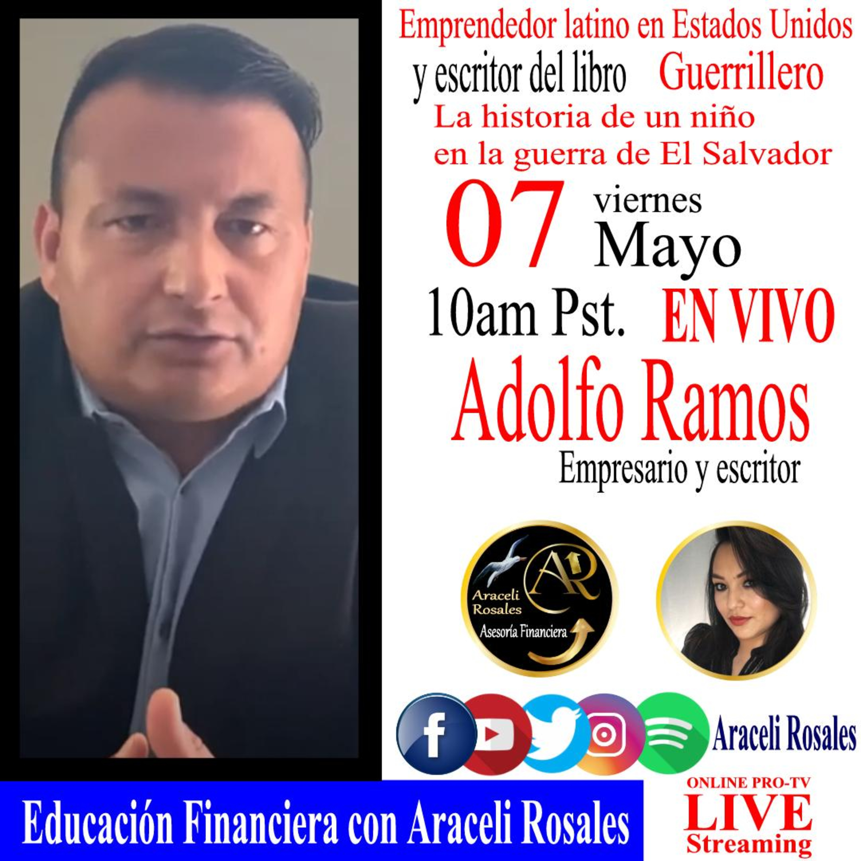 En #EducaciónFinancieraConAraceliRosalesme acompañó Adolfo Ramos Portillo, emprendedor latino en Estados Unidos y escritor del libro Guerrillero, ‘’historia de un niño en la guerra de El Salvador’’.