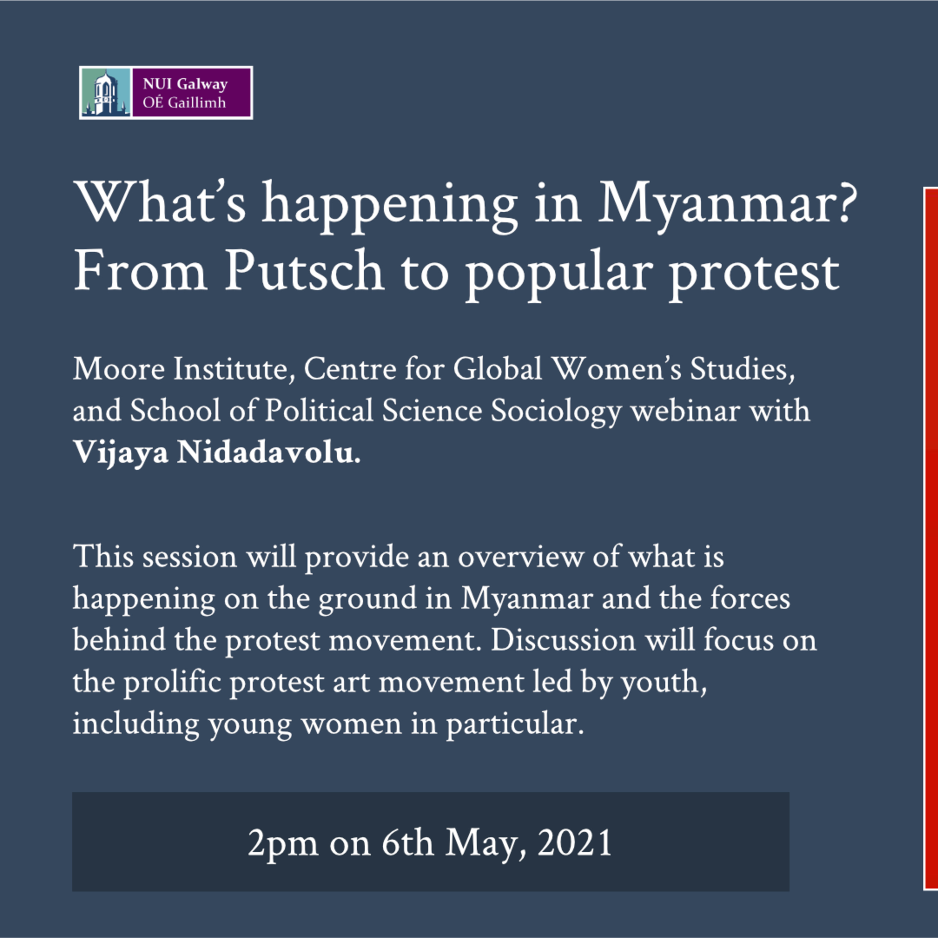 Further details: https://mooreinstitute.ie/event/whats-happening-in-myanmar-from-putsch-to-popular-protest/