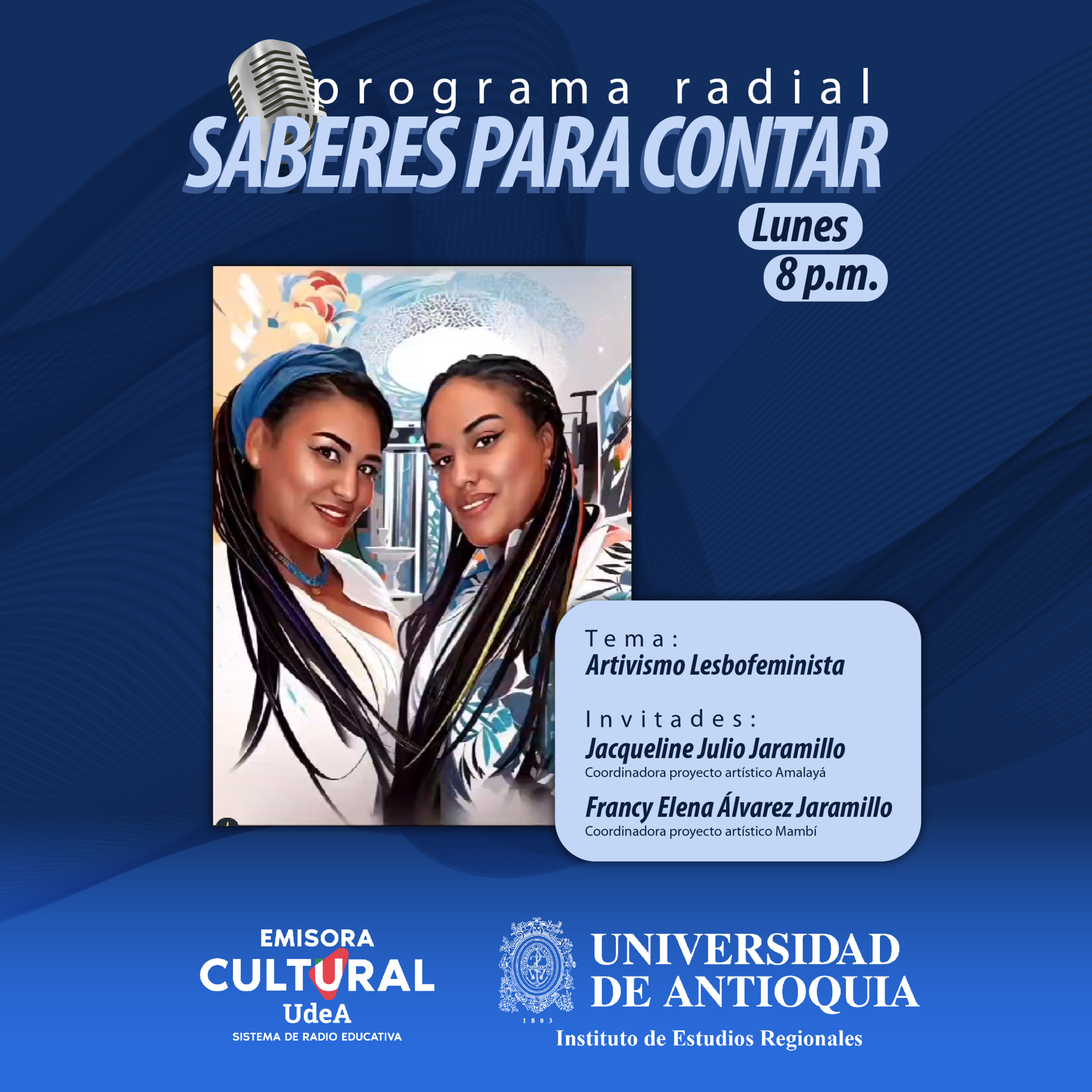 Iniciamos el mes de diciembre con un nuevo programa de Saberes para contar, iniciativa radial del Instituto de Estudios regionales de la UdeA. En esta emisión nuestro tema fue “Artivismo Lesbofeminista”. Para conversar de ello, nos acompañaron Jacqueline Julio Jaramillo, coordinadora del colectivo Amalayá y Francy Elena Álvarez Jaramillo, coordinadora del colectivo Mambí. También estuvo en la conducción del programa la profesora del Iner Alejandra Bello Urrego.