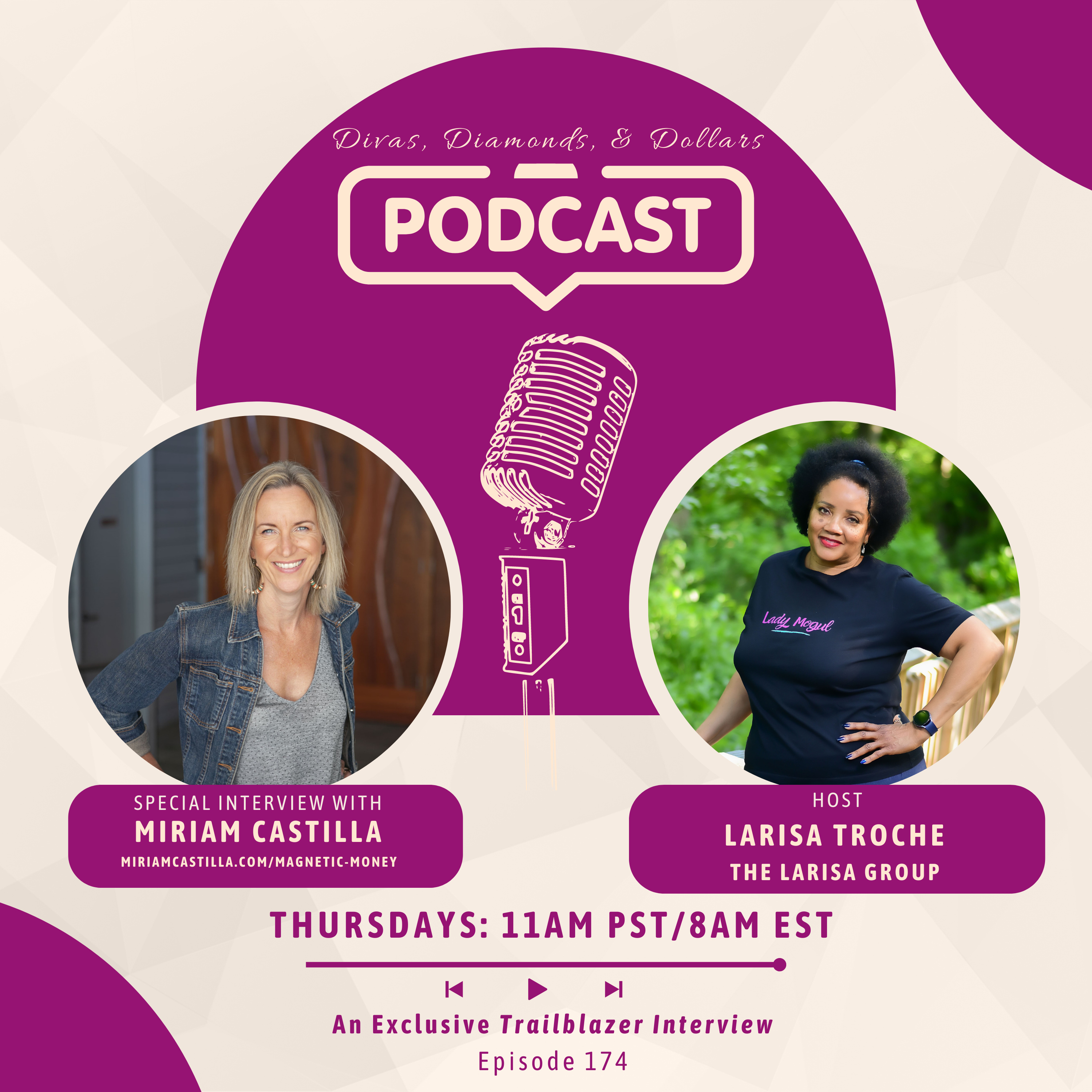 Today's conversation is with Coach, Author and award-winning business owner Miriam Castilla who is passionately helping women in business transform their money mindset and their finances so they can fulfill their highest potential. Listen now to find out about "magnetic-money" and how to create your own "money babies"! Miriam is the author of "Today's Woman - Life Balance Secrets" and "5-Minute Money System." Be sure and share this episode with your bestie! To learn more about Miriam's programs, visit www.MiriamCastilla.com/Magnetic-Money