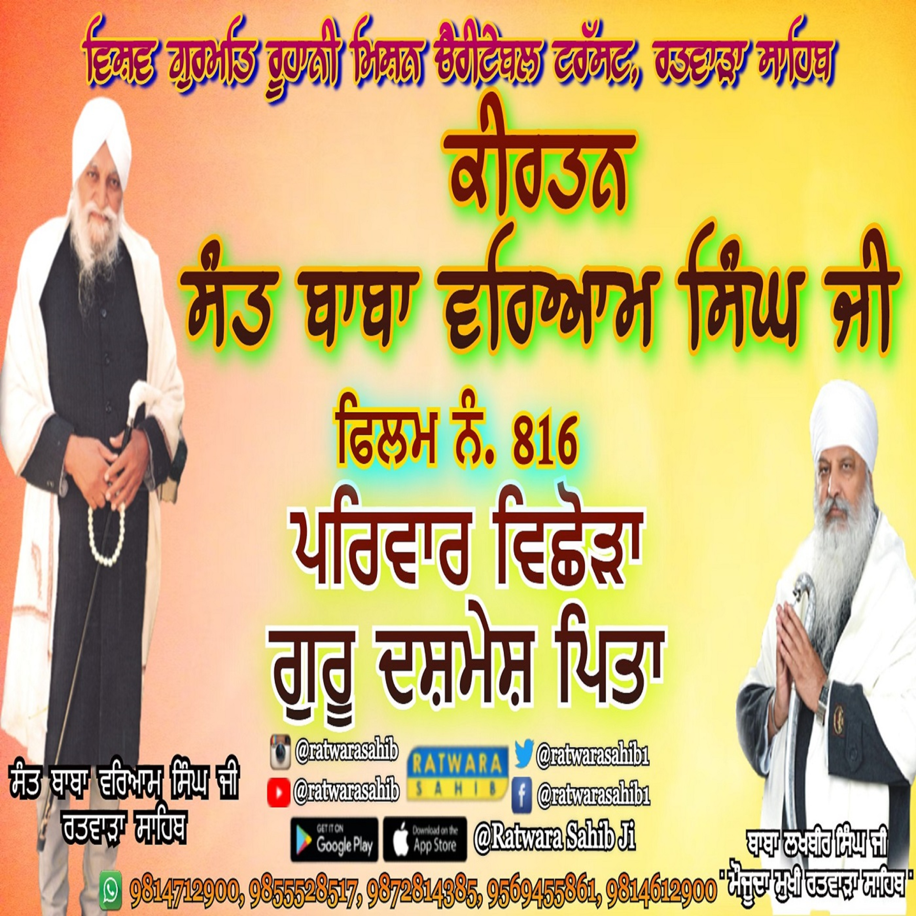ਫਿਲਮ ਨੰ 816 | ਕੀਰਤਨ ਸੰਤ ਬਾਬਾ ਵਰਿਆਮ ਸਿੰਘ ਜੀ ਰਤਵਾੜਾ ਸਾਹਿਬ | ਸਾਖੀ : ਪਰਿਵਾਰ ਵਿਛੋੜਾ ਗੁਰੂ ਦਸ਼ਮੇਸ਼ ਪਿਤਾ |