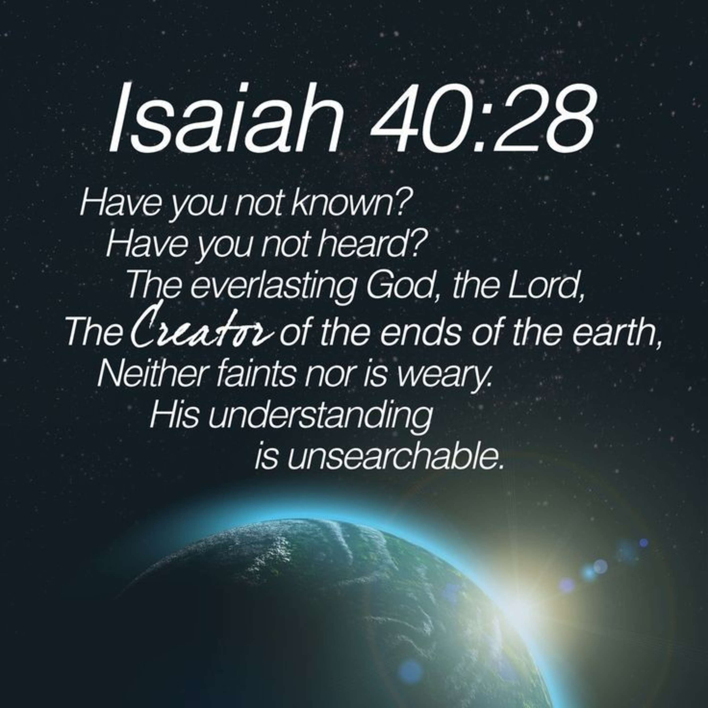 Isaiah 40:28 Do you not know? Have you not heard? The Lord is the everlasting God, the Creator of the ends of the earth. He will not grow tired or weary, and his understanding no one can fathom.