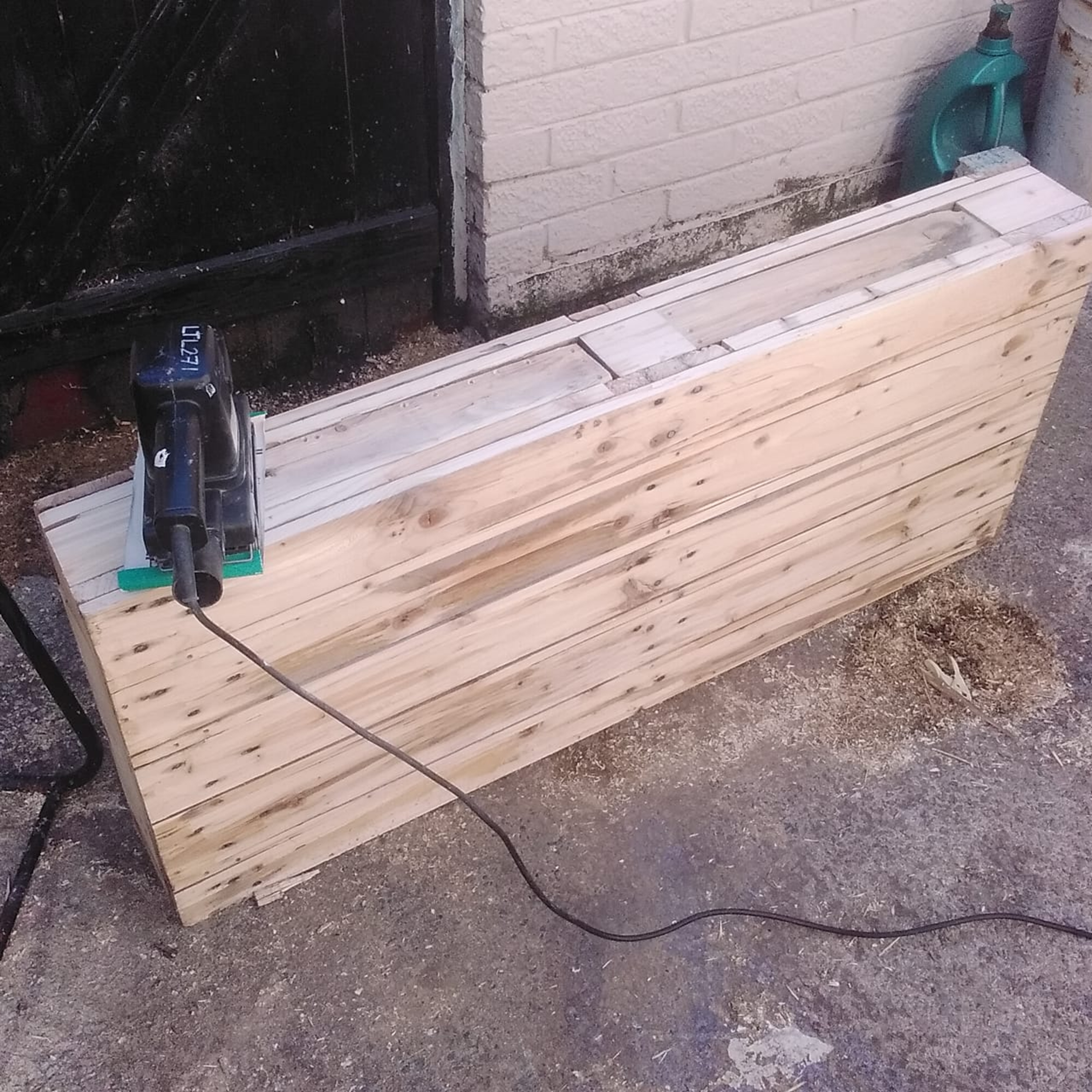 Sanding down the pallet coffee table.