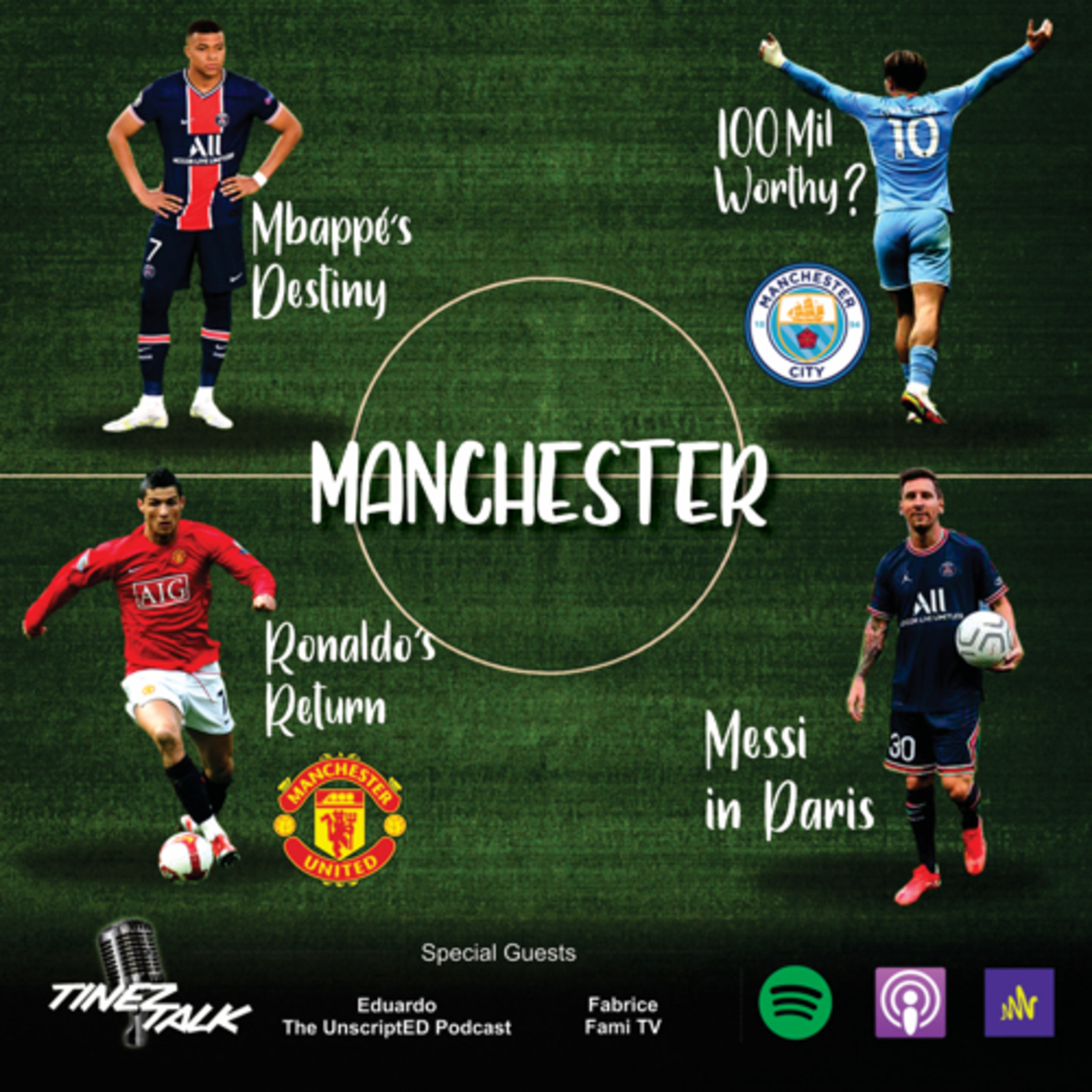 Chaos erupts in Manchester with the news of Cristiano Ronaldo's return. A transfer window filled with major moves for big clubs like City and United connects with Messi's move to PSG, Mbappe's destination, Grealish’s massive fee and Champions League talk. A Manchester Derby debate evolves when Eduardo from The UnscriptED Podcast, Fabrice from Fami TV and host, Marcelo talk fútbol via zoom for the second time on Tinez Talk.