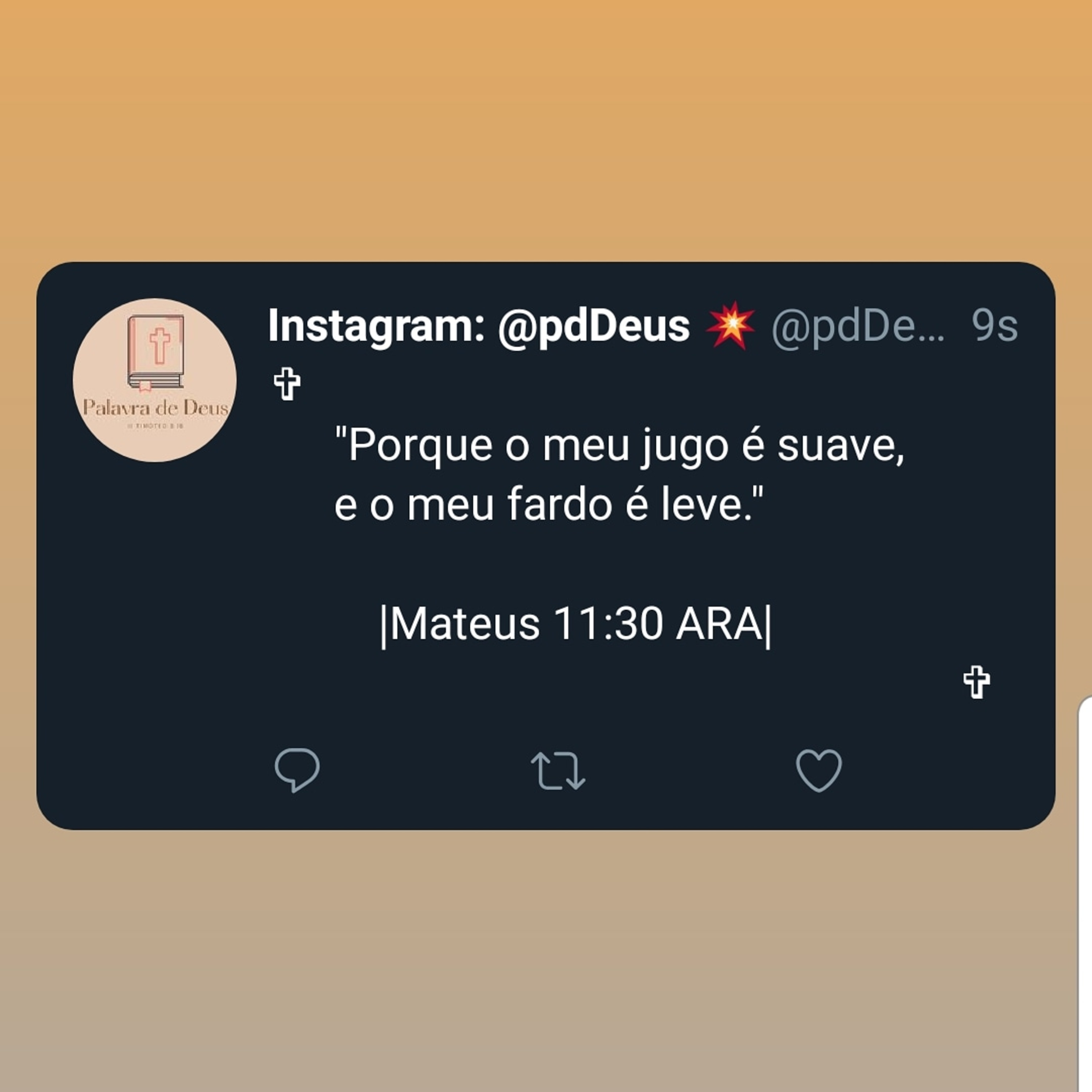 Que a paz, o alívio, a mansidão e a humildade de Cristo sejam com vocês, e tomem posse do fardo leve que Jesus trocou pelo seu naquela Cruz. Amém?