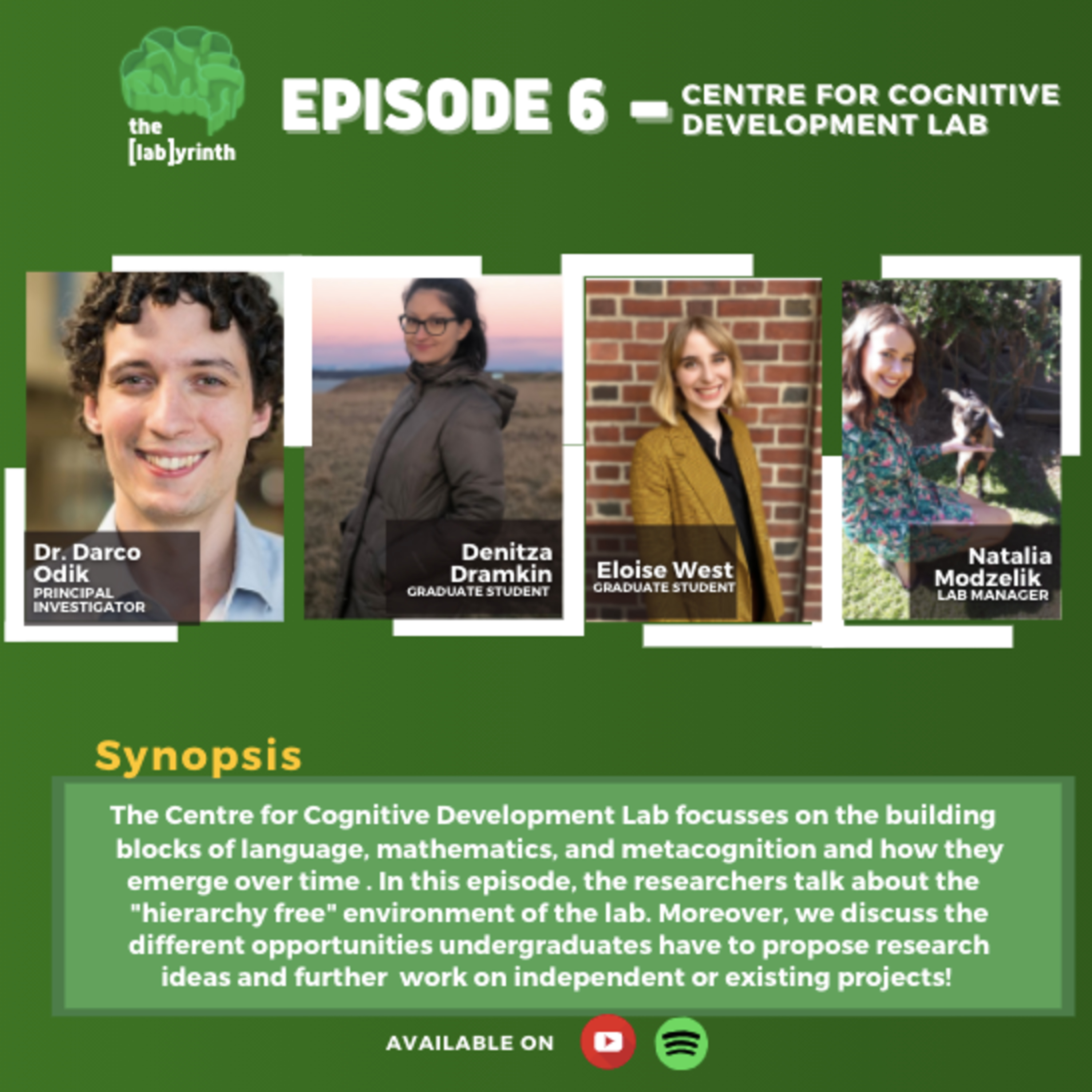 In our sixth episode, Executive Coordinator- Events, Aadhya Mittal invites Dr. Darco Odik and his lab members: Denitza Dramkin, Eloise West and Natalia Modzelik to discuss their focus on the building blocks of language, mathematics, and metacognition and how they emerge over time. In this episode, the researchers talk about the "hierarchy free" environment of the lab, different opportunities undergraduates have to propose research ideas and further work on independent or existing projects!