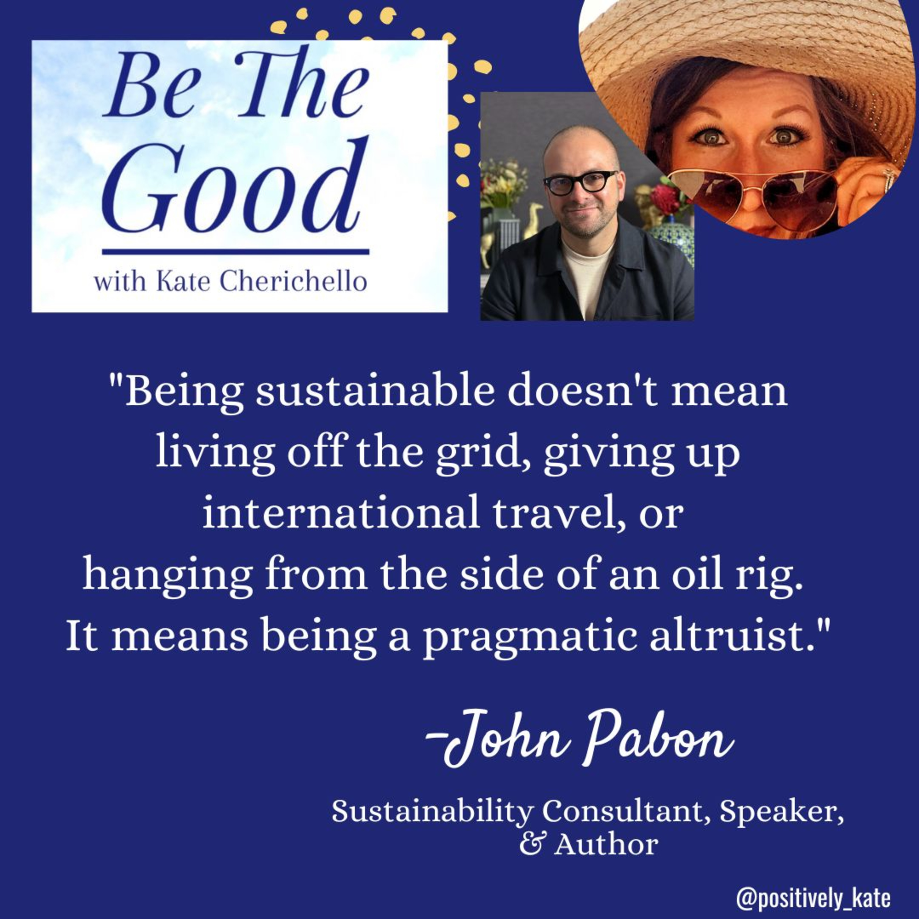 Today on Be The Good with Kate, John Pabon is doing all he can to save this earth: traveling the world researching, learning, teaching... He describes himself as a pragmatic altruist and is an expert in sustainability. He gives us a window into his world and helps us understand how both companies and individuals are and can be a part of making the world a better place.