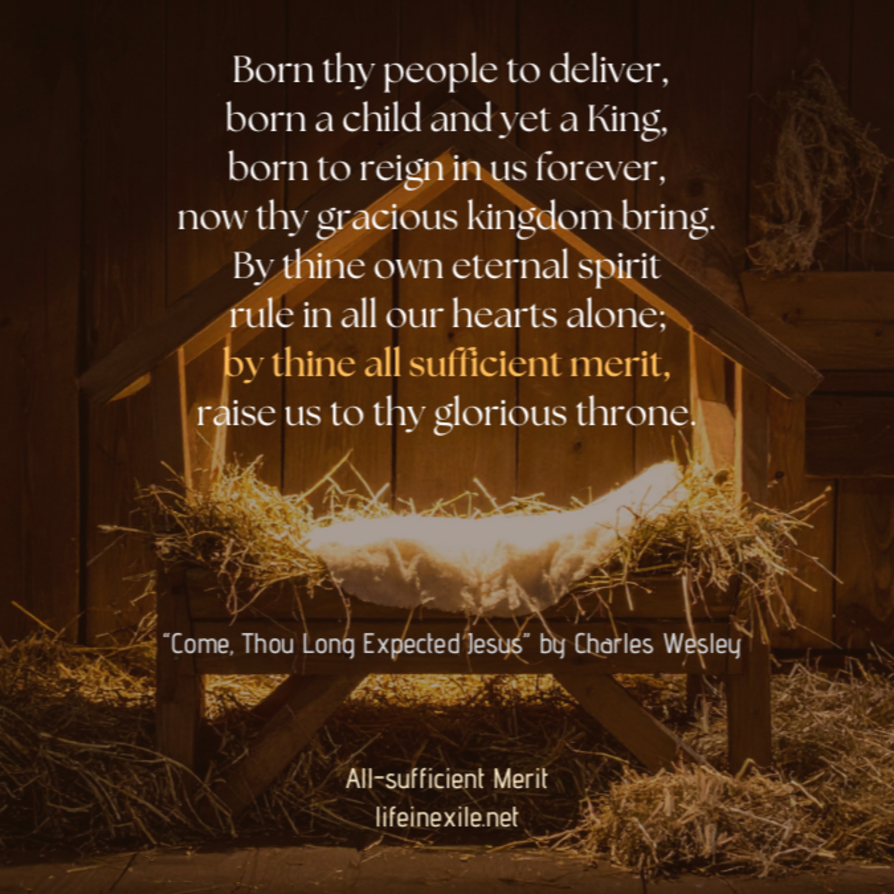 Christmas hymns can have deep theology and cause us to ponder the greatness of the child. Today, we meditate on his all-sufficient merit from a line of Charles Wesley's hymn, Come, Thou Long Expected Jesus.