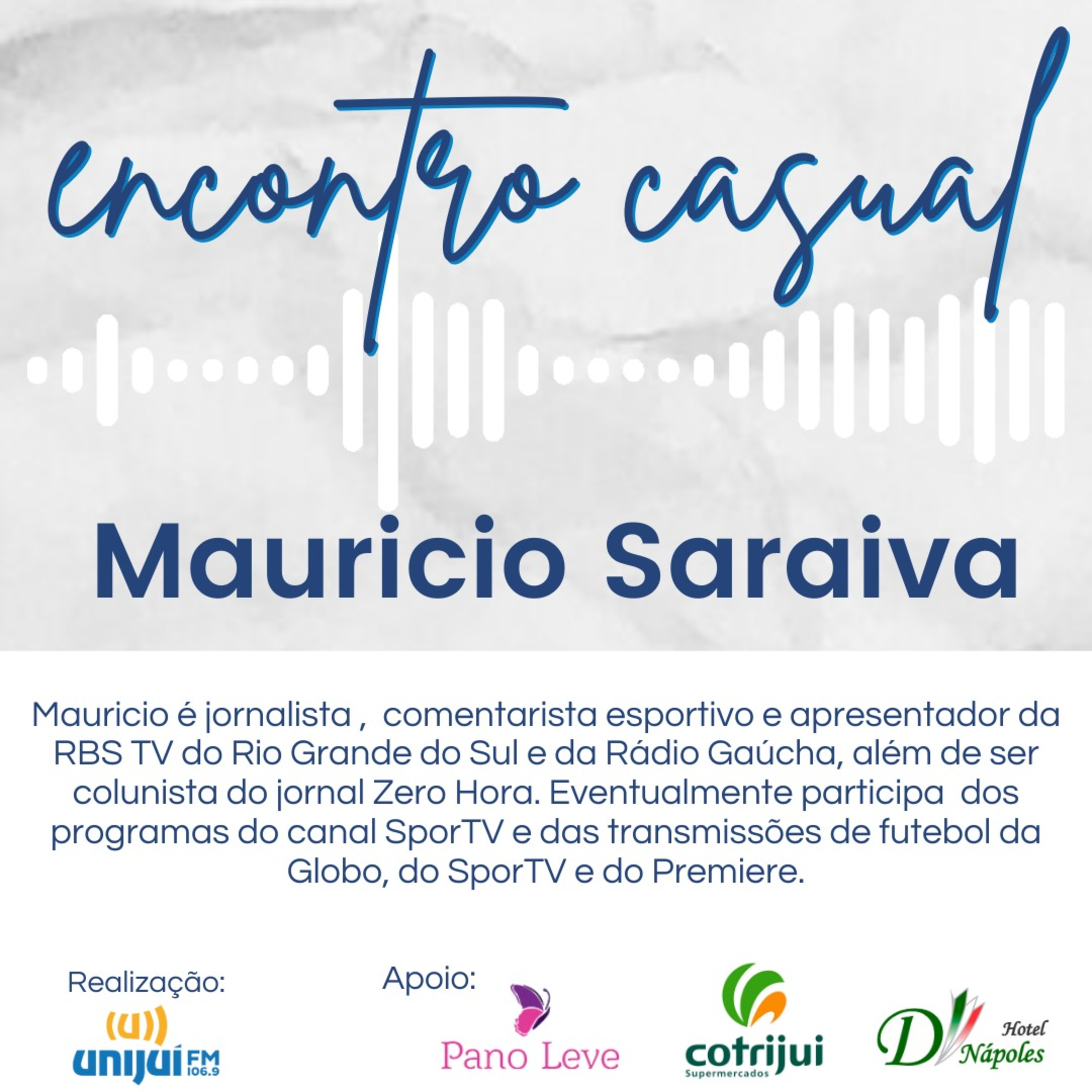 O Encontro Casual deste final de semana recebe Mauricio Saraiva que é jornalista, comentarista esportivo e apresentador da RBS TV do Rio Grande do Sul e da Rádio Gaúcha, além de ser colunista do jornal Zero Hora. Eventualmente participa dos programas do canal SporTV e das transmissões de futebol da Globo, do SporTV e do Premiere. E claro que tem as músicas escolhidas pelo Mauricio. Vale a pena conferir este super bate papo!