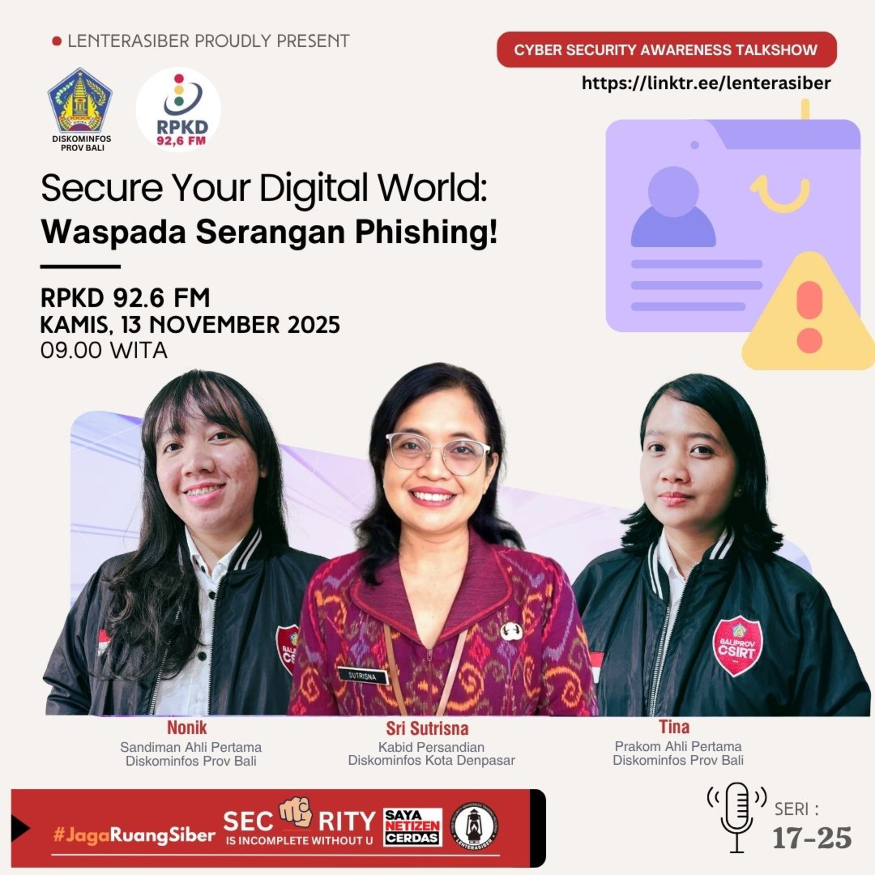 Cyber Security Awareness Talkshow :: Seri 17 Tahun 2025 di RPKD 92,6 FM menghadirkan Ibu Sri Sutrisna (Kabid Persandian Diskominfos Kota Denpasar), Nonik (Sandiman Ahli Pertama Diskominfos Prov Bali), dan Tina (Pranata Komputer Ahli Pertama Diskominfos Prov Bali) dengan topik Waspada Serangan Phishing.