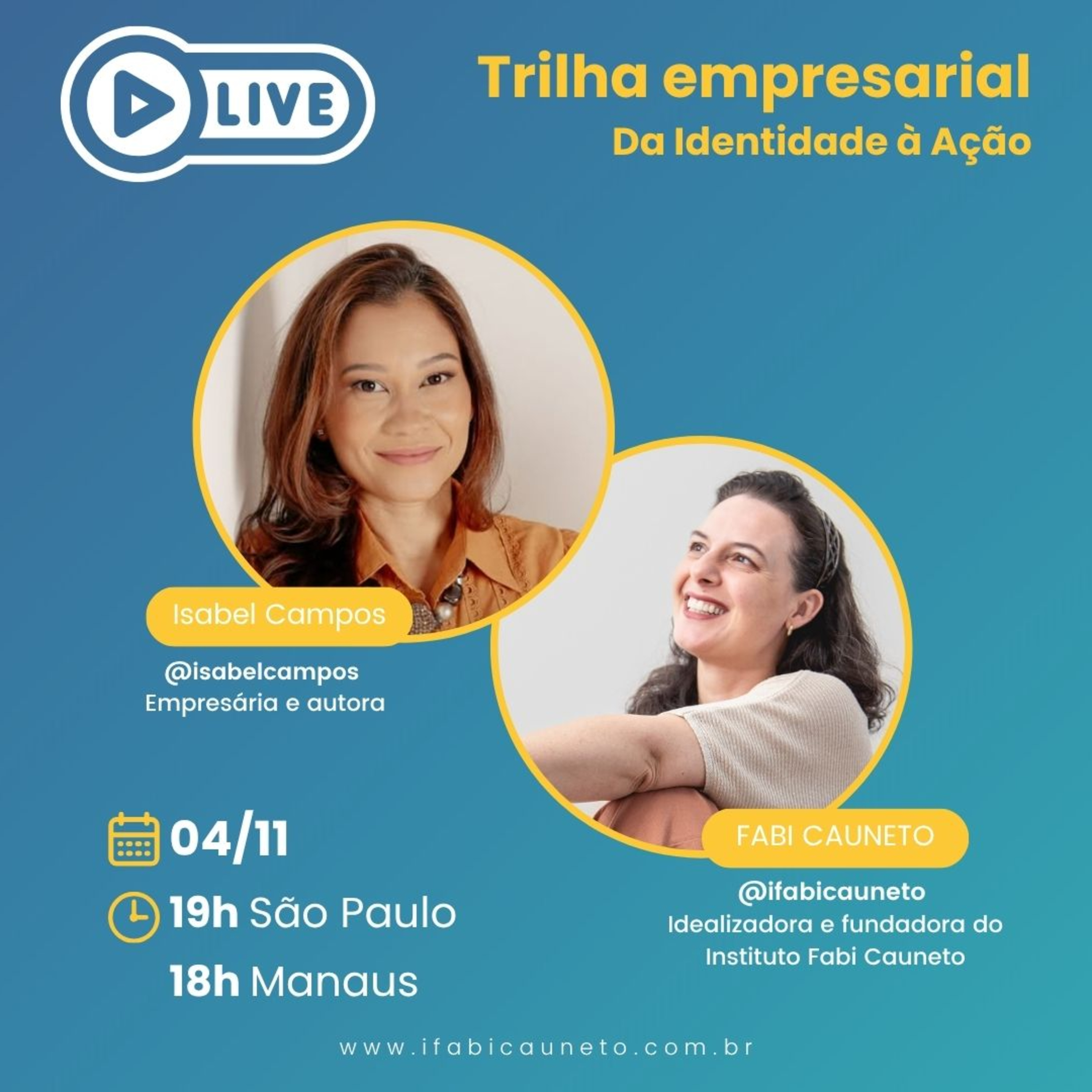 Neste papo (sempre bom demais) com Isabel Campos falamos sobre o lançamento de seu livro “Trilha empresarial, da identidade à ação”, os processos para a escrita e os reais objetivos da obra para seus leitores.Hoje, 04/11 também é aniversário de 6 anos do Instituto Fabi Cauneto 🥳 e diante deste tema “trilha empresarial” eu, Fabi Cauneto falei um pouco sobre como foi “a trilha” do Instituto até aqui e como mestres e mentores (incluindo a Bel Campos) contribuíram para o desenvolvimento do meu negócio até o momento. 💗Um papo leve com pitadas reflexivas pra você, alma corajosa se inspirar !💁♀️ O livro da Isabel está disponível na Amazon (versão eletrônica) no link: https://amzn.to/47qBVLXSOBRE ISABEL CAMPOSEmpresária, consultora, palestrante e escritora. Administradora e Especialista em Desenvolvimento Sustentável e Gestão de Negócios, com certificações internacionais em metodologias de inovação e comportamento. Estruturou mais de 560 negócios em diversos países e treinou milhares de empreendedores. Mãe de três filhas, decidiu em 2016 deixar a estabilidade do emprego para criar seu próprio negócio, dando origem a Trilha Empresarial — uma metodologia que une estratégia, identidade e fé na construção de negócios transformadores.Instagram: https://www.instagram.com/isabelcampos/LinkedIn: https://www.linkedin.com/in/isabelferreiracampos/