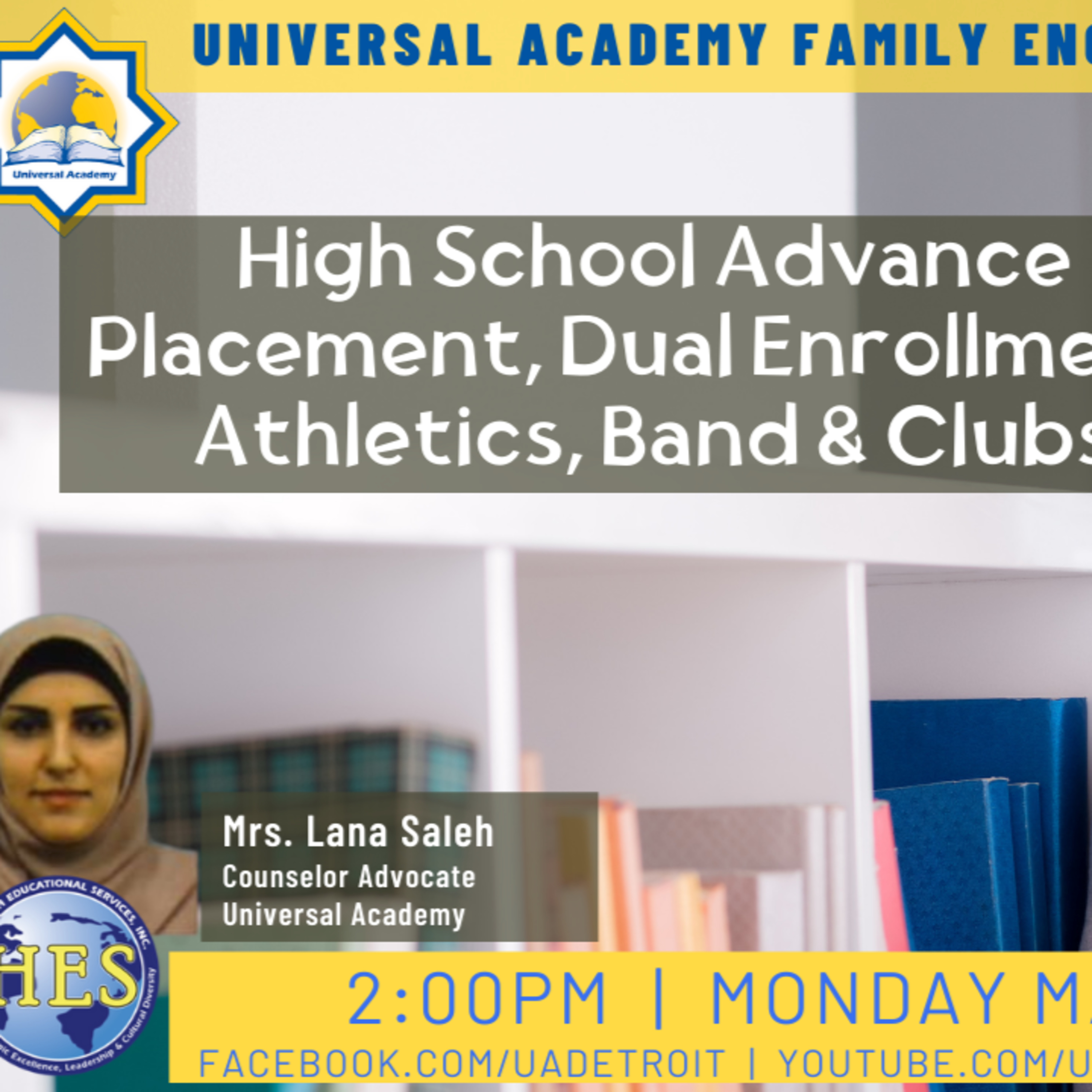 In this Universal Academy Family Engagement Session, information will be provided about students preparing themselves for the upcoming high school years. They will be able to know the requirements needed for each grade level and are able to decide what classes to take, other than their core requirements. They will be familiar with graduation requirements as well as being aware of the state exams required to take each year. This session will be presented by Mrs. Saleh, the counselor at Universal Academy. She graduated from the University of Michigan Dearborn and has been working in schools all over the world for the past 13 years.