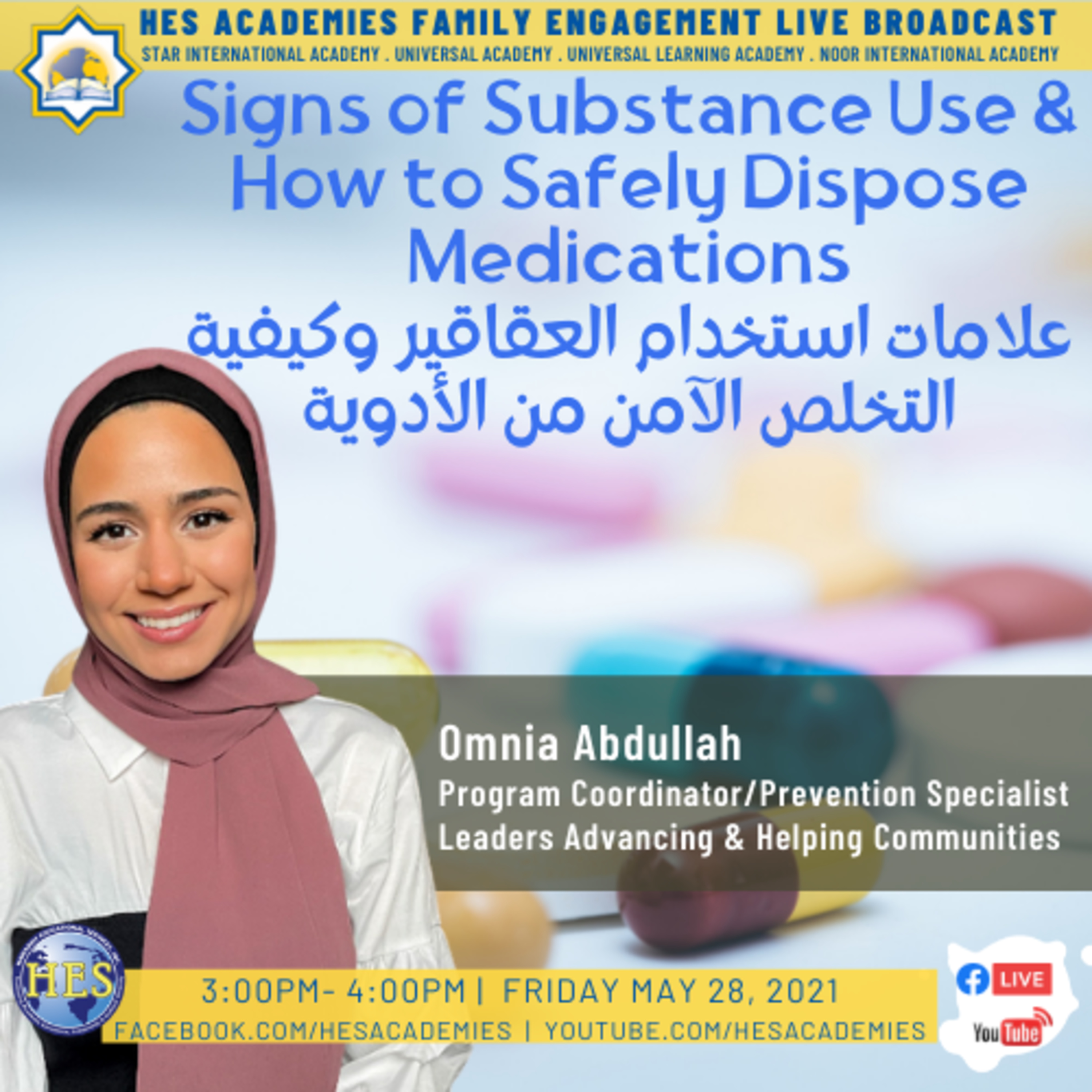 Each year, more than 500,000 children under the age of five experience a potential poisoning related to medications. Join us this Friday, May 28, 2021 at 3PM for a Family Engagement Live Broadcast titled Signs of Substance Use and How to Safely Dispose Medications with Omnia Abdullah, Program Coordinator/Prevention Specialist at Leaders Advancing & Helping Communities (LAHC)
