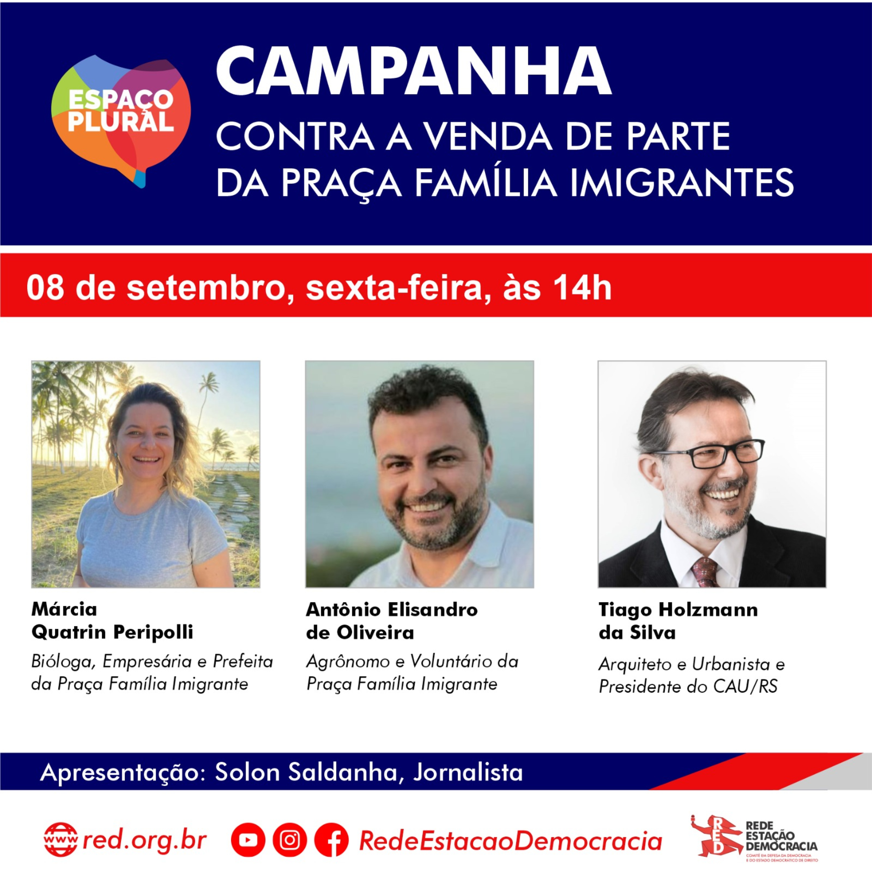 Receberemos a Bióloga, Empresária e Prefeita da Praça Família Imigrante Marcia Quatrin Peripolli, o Agrônomo e Voluntário da Praça Família Imigrante Antonio ELisandro de Oliveira e o Arquiteto e Urbanista e Presidente do CAU/RS Tiago Holzmann da Silva.