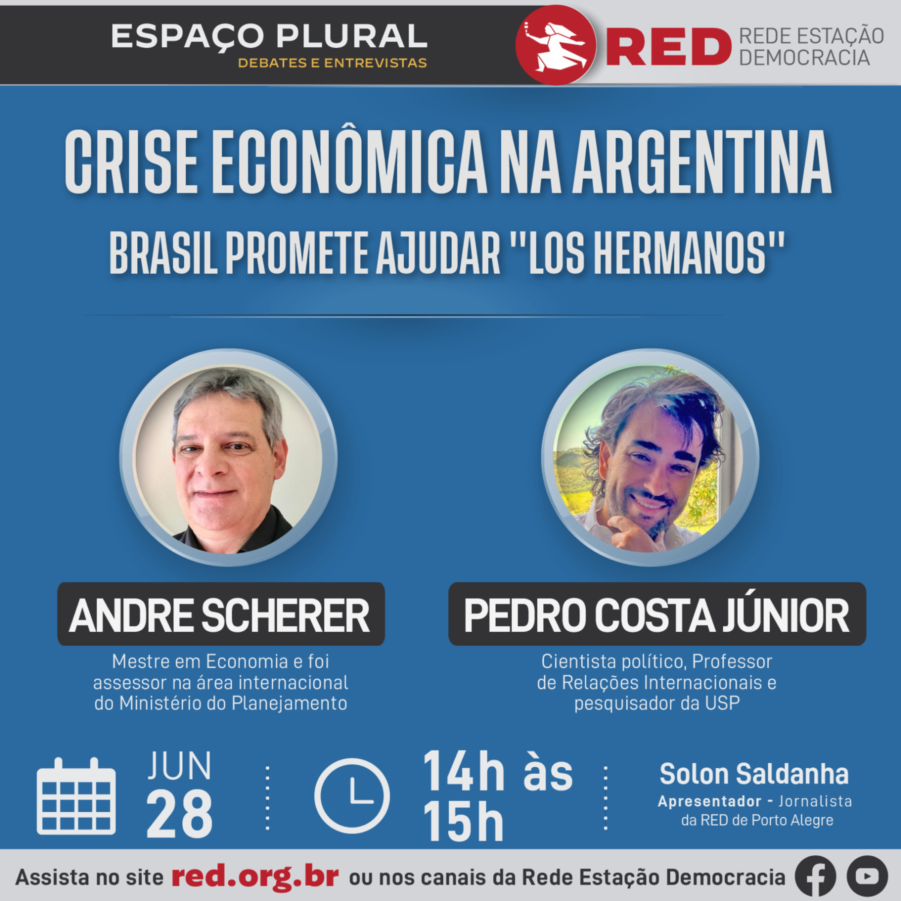 Receberemos o Mestre em Economia, Economista no Estado RS. Foi assessor na área internacional do Ministério do Planejamento entre 2015-16, André Scherer; e o Cientista político, Professor de Relações Internacionais e pesquisador da USP. Autor do livro "Colapso ou Mito do Colapso ou Mito do Colapso?, Pedro Costa Junior.