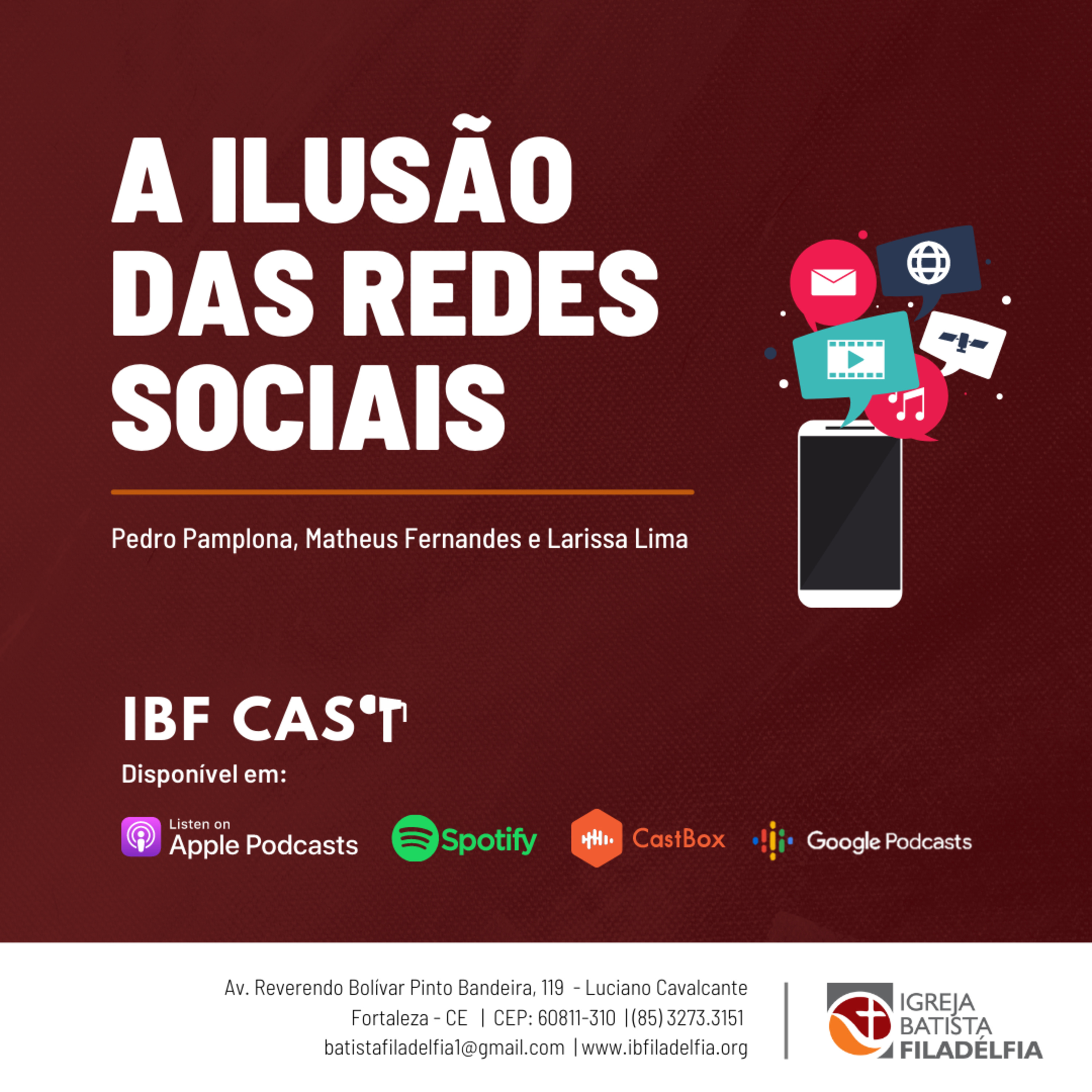 Gravação da mesa redonda com Pedro Pamplona, Matheus Fernandes e Larissa Lima falando sobre as ilusões das redes sociais e como elas afetam algumas áreas de nossas vidas. Um conteúdo importantíssimo para os dias atuais, focando na vida social, na vida em igreja e na relação entre pastor e ovelhas.
