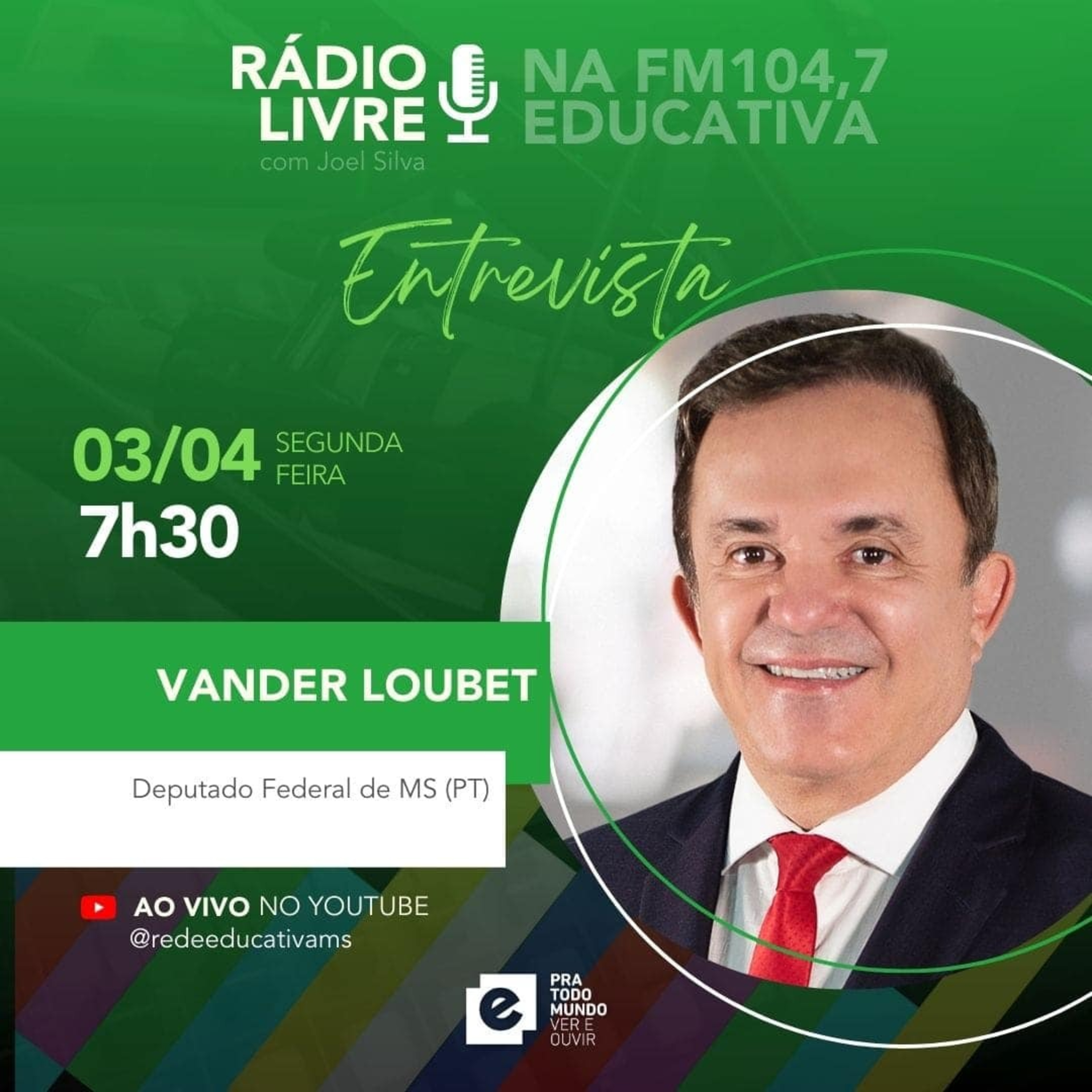 O Rádio Livre entrevista o Deputado Federal pelo PT de Mato Grosso do Sul, Vander Loubet. A entrevista foi ao ar no dia três de abril durante o programa na FM Educativa 104.7. Com produção e apresentação de Joel Silva, o Rádio Livre vai ao ar de segunda a sexta, 7h da manhã na FM Educativa 104.7.