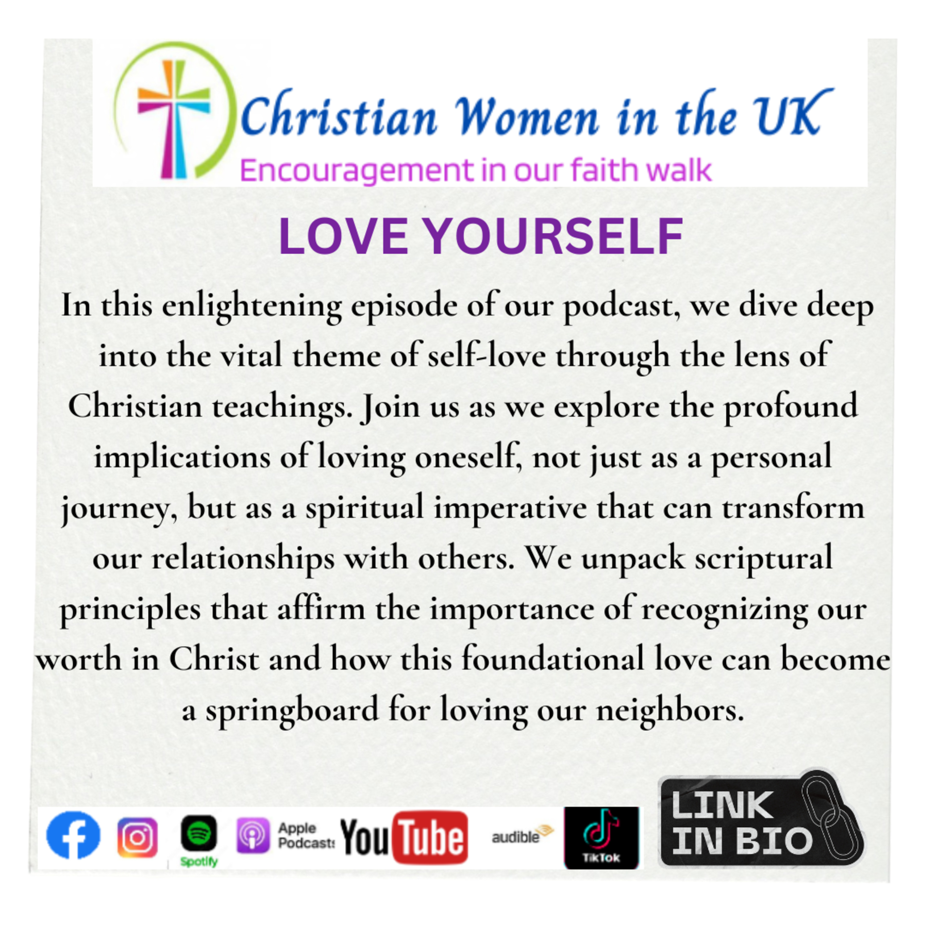 In this enlightening episode of our podcast, we delve into the profound concept of self-love from a Christian perspective. Join us as we unpack the biblical teachings that encourage us to embrace and nurture our own worth, reflecting on the importance of loving ourselves as a vital foundation for living out our faith. We explore the transformative power of self-acceptance and how it aligns with God’s view of us as His cherished creations.But the journey of self-love doesn’t stop there. We discuss how cultivating a genuine love for ourselves can overflow into our relationships with others. As we learn to appreciate our own value, we become better equipped to love our neighbors, fostering unity and compassion within our communities. Our conversation touches on practical steps to enhance our self-love, as well as the ripple effects it can create in our interactions with those around us.Tune in as we share insights, scripture, and heartfelt conversations that challenge you to reflect on your own self-love journey, and inspire you to extend that love outward in ways that can transform not only your life but also the lives of those around you. Whether you’re tuning in during your commute or while enjoying a quiet moment at home, this episode invites you to rethink the relationship you have with yourself and the world.