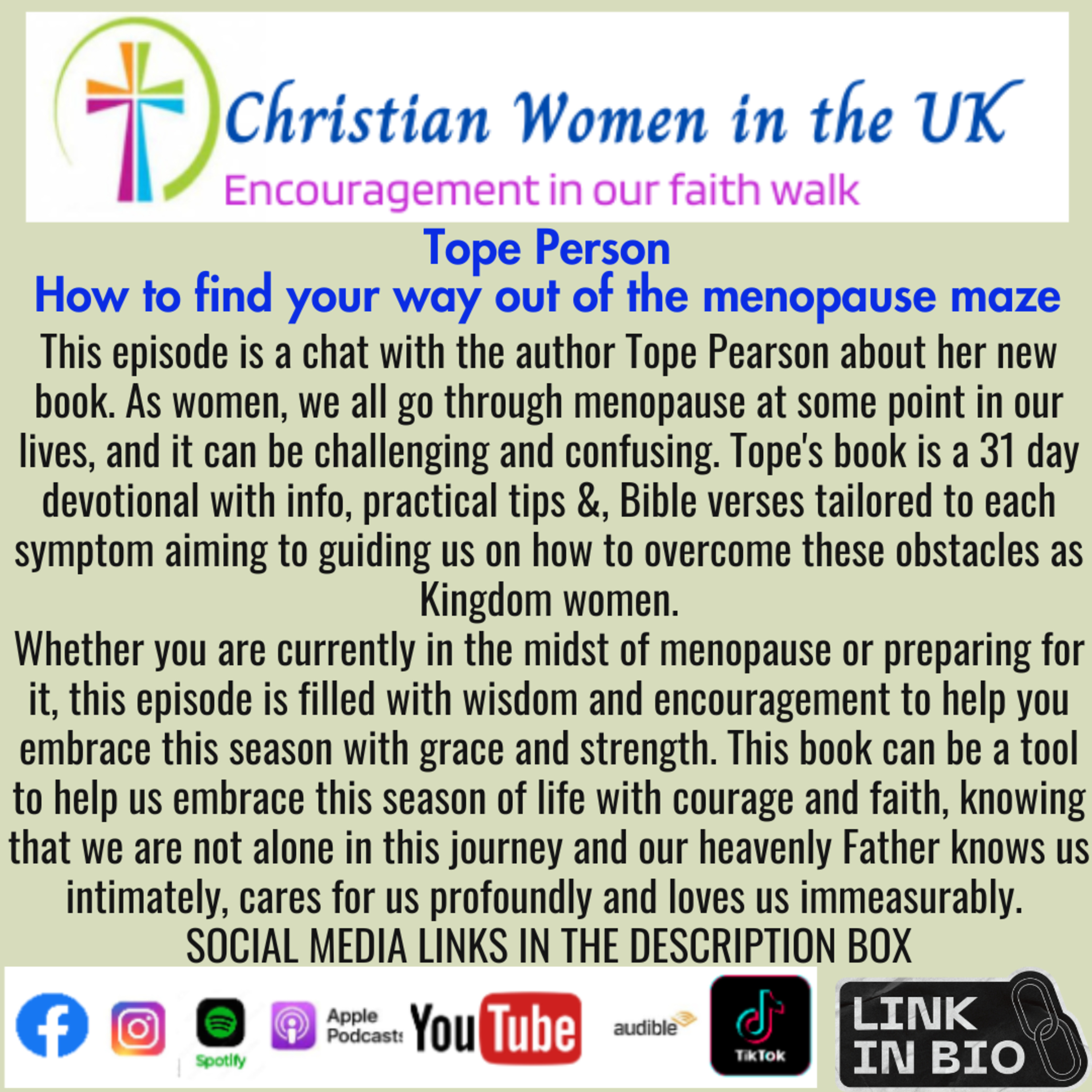 Welcome to our latest episode where we sit down with the author Tope Pearson to discuss her new book, How To Find Your Way Out of the Menopause Maze. As women, we all go through the journey of menopause at some point in our lives, and it can be a challenging and confusing time. Tope's book is a 31 day devotional filled with helpful tips, practical advice, Bible verses, and short messages tailored to each symptom, guiding us on how to overcome these obstacles as Kingdom women.We discuss the importance of self-care during menopause, the power of faith in overcoming challenges, and the beauty of finding community and support during this transformative time. Whether you are currently in the midst of menopause or preparing for this stage of life, this episode is filled with wisdom and encouragement to help you embrace this season with grace and strength. Tope's book shares her wisdom and insight on navigating through the menopause maze with grace and strength. Her gentle and compassionate approach to discussing this often taboo topic is both empowering and uplifting. This book can be a tool to help us embrace this season of life with courage and faith, knowing that we are not alone in this journey and our heavenly Father knows us intimately, cares for us profoundly and loves us immeasurably. Facebook:@Youfitperfectly@EquippingtheSaintsMinistriesUKInstagram:@you.fit.perfectlyYouTube channel:@youfitperfectly7436@etsministries3166