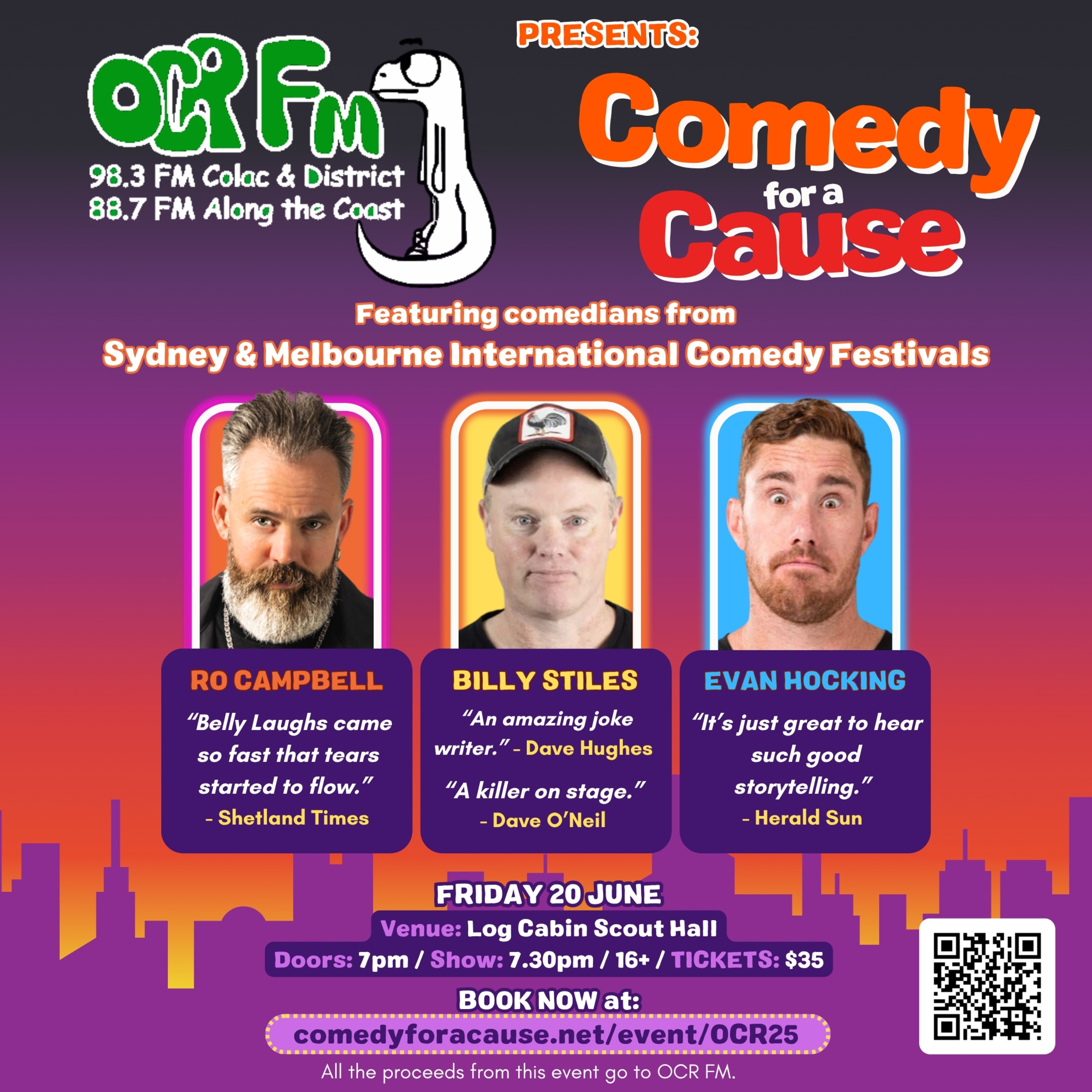 Evan chats about the upcoming 'Comedy for a Cause' fundraiser for OCR FM community radio station - happening this Friday night at the Colac Log Cabin Scout Hall.