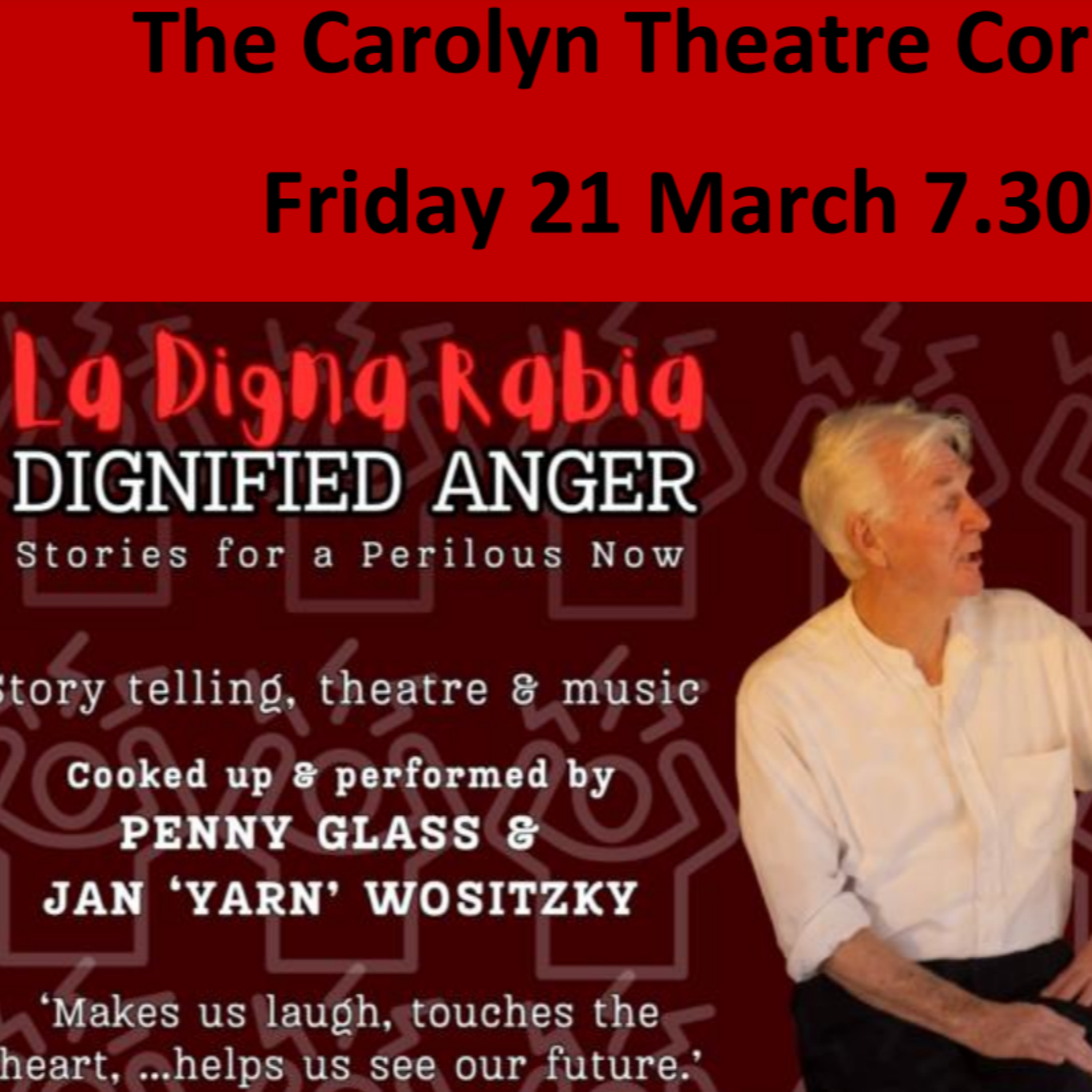 Jan chats to Jonathan about the upcoming performance of 'Dignified Anger' at the Red Rock Regional Theatre and Gallery on Friday 21st of March.