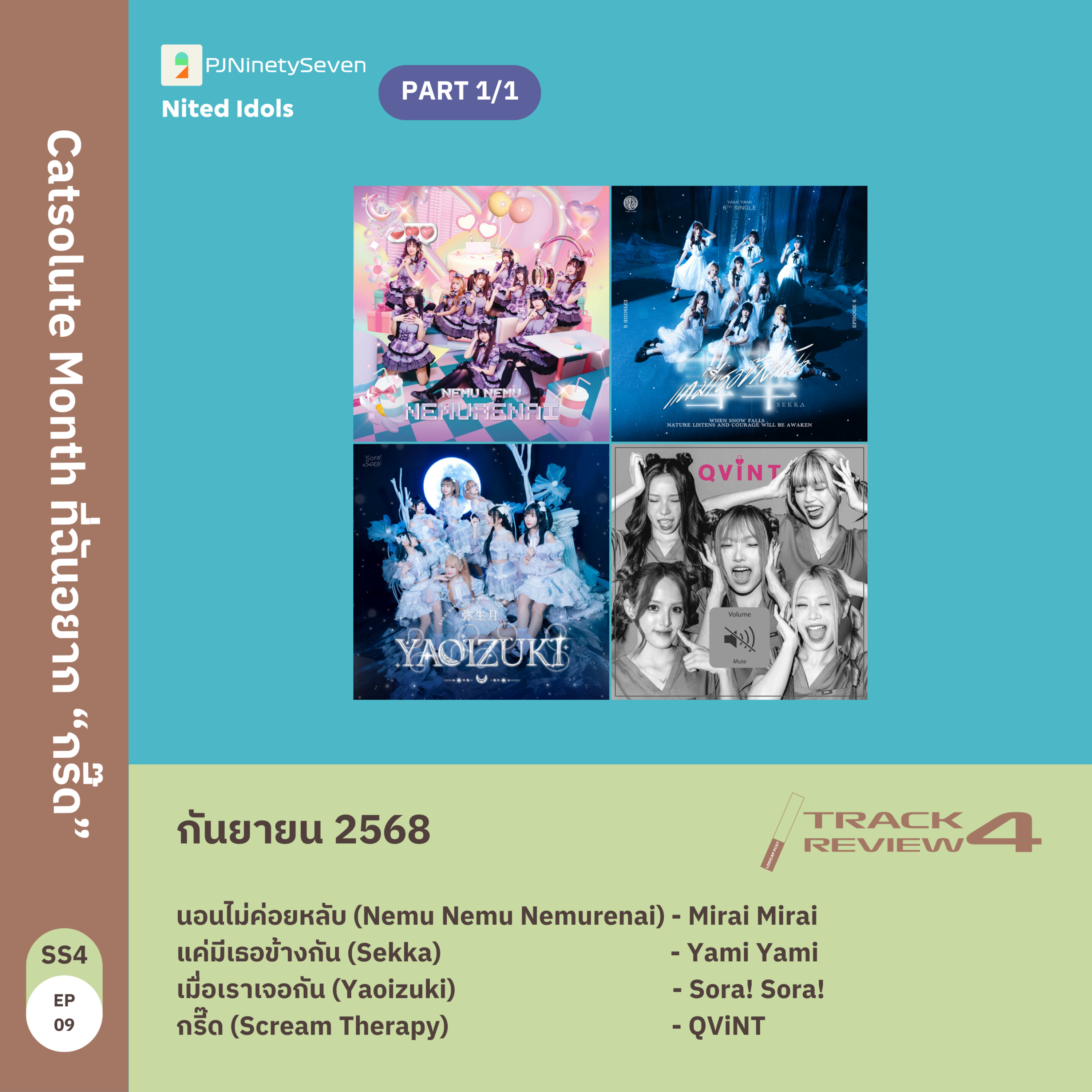 สิ้นเดือนแบบนี้ มากันอีกครั้งครับ เพชร นน ขนข่าว ขนงานไอดอล และขนเพลง 4 เพลง มารีวิวให้ทุกท่านได้ฟังใน Track Review Season 4 ที่เดือนนี้ เป็น "เดือนบ้านแมว Catsolute Month + 1" เพราะอะไร ลองฟังในรายการ แต่ 4 เพลงที่รีวิวในเดือนนี้ มีดังนี้ครับ