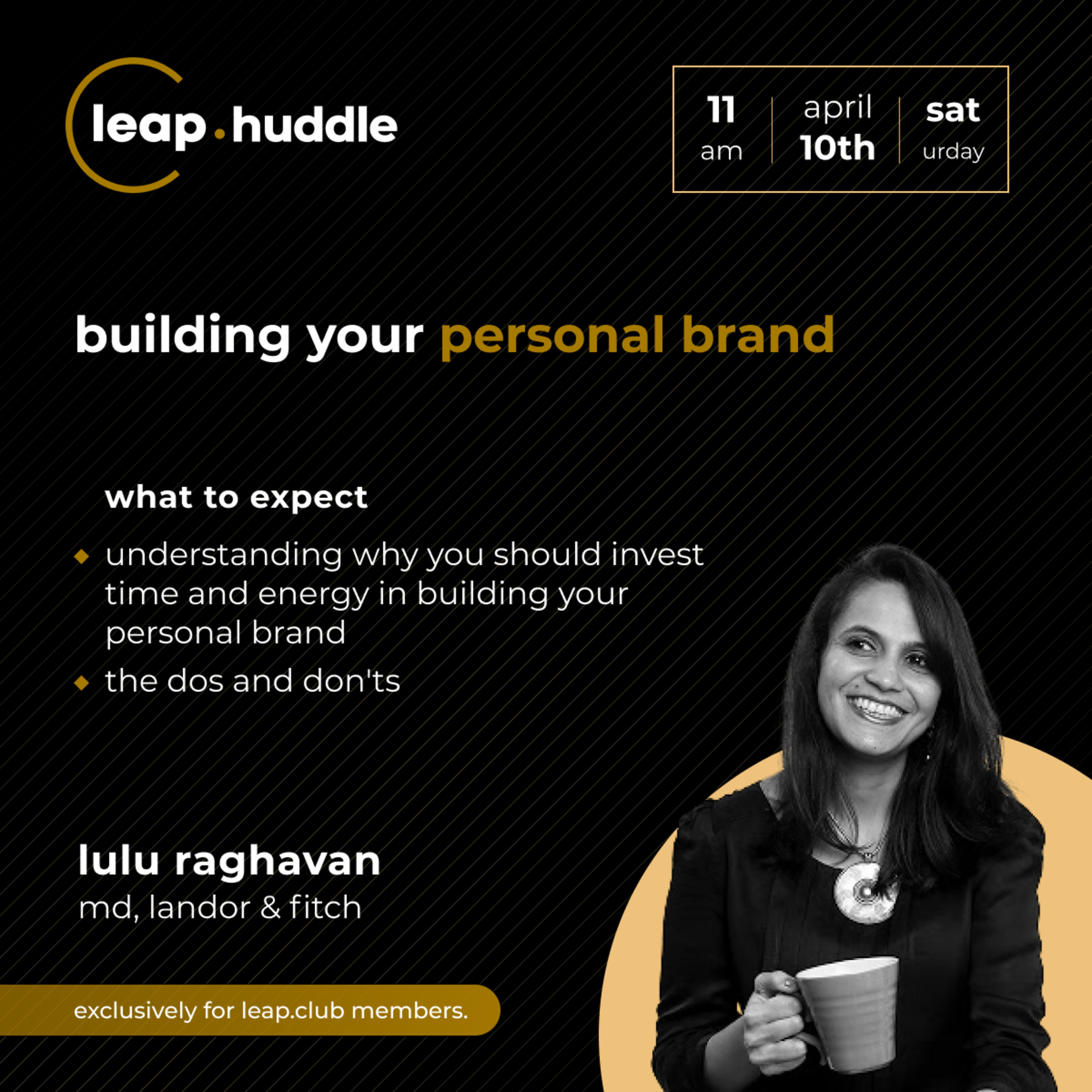 it is no secret that building a personal brand is imperative to career growth. but a lot of us don't know where or how to begin. for our upcoming member led huddle, we have Lulu Raghavan, the managing director of Landor & Fitch, india, the world's largest specialist brand and design group. lulu has been in the business of building brands since 1997 and is credited with single-handedly setting up landor's business in india.