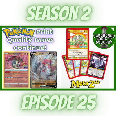 Pokemon continues to have terrible print quality. We discuss the future sets. MetaZoo is coming out with HiroQuest promos with Steve Aoki CD. Check our awesome podcast about how we protect and store our cards: https://youtu.be/N1mSu1OlaXQ News, Analysts, Breakdowns, and Personal thoughts, come join in the fun discussing it all with us. Check us out on the following: Twitter: https://twitter.com/addicts_podcast Instagram: https://www.instagram.com/cardboard_addicts_podcast Tiktok: https://www.tiktok.com/@cardboardaddictspodcast