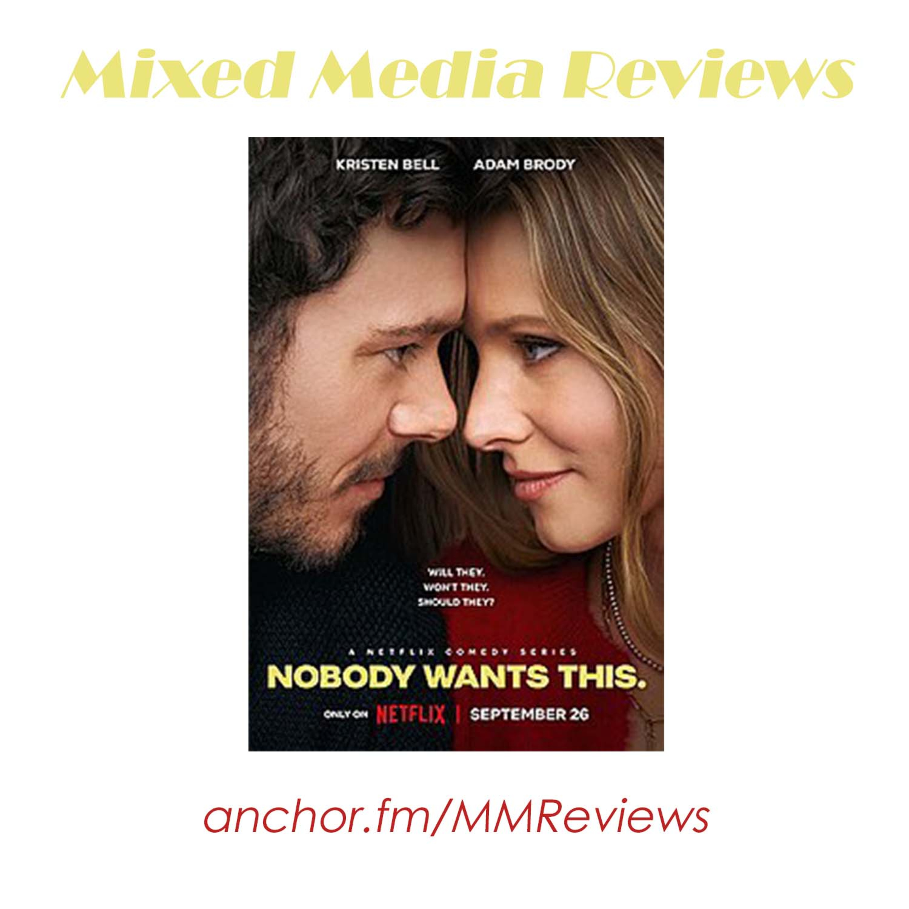 Hello everyone! Today's episode will be a fairly spoiler-free discussion of the Netflix TV Show: Nobody Wants This! I will briefly go over the summary, talk about the things I loved, and then talk about one thing that I thought was a critique but actually was irrelevant! Please don't forget to follow me on https://www.facebook.com/MixedMediaReviewsPodcast/, https://www.instagram.com/mixedmediareviewspodcast/, and https://www.tumblr.com/mixedmediareviewspodcast at Mixed Media Reviews Podcast. Leave me a message or comment on social media if you have any suggestions or if you want to continue the conversation! Or if you just want to say hi! Thanks for listening!