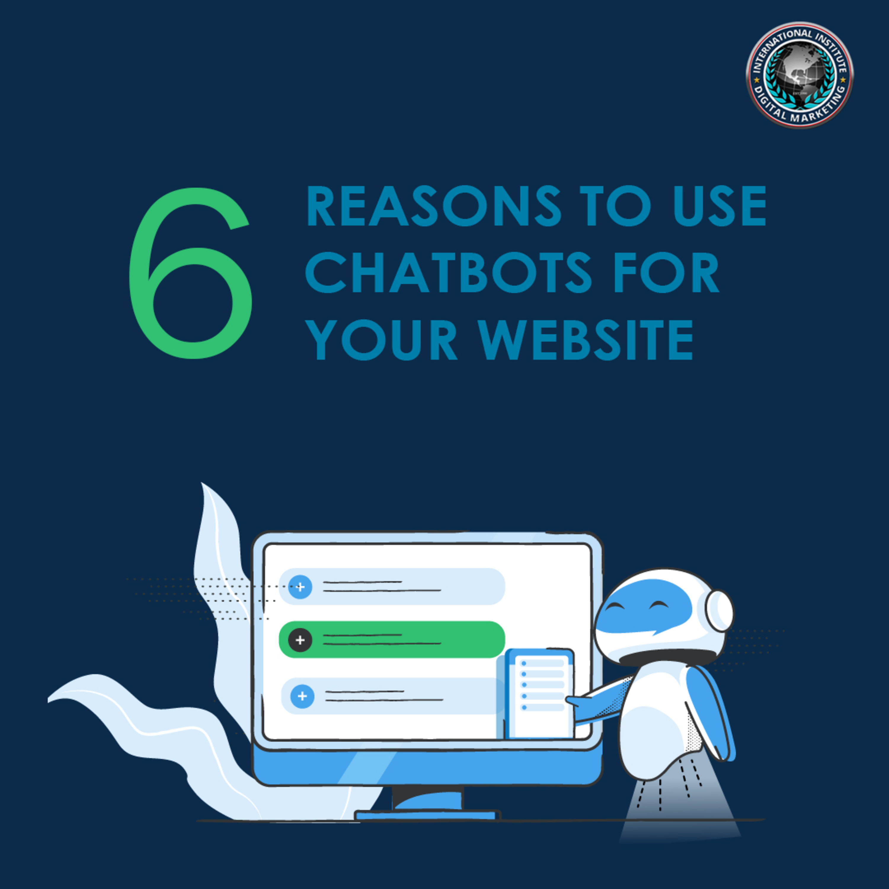 Hi, I’m Cally, from the International Institute of Digital Marketing. Here are 6 Reasons to use chatbots for your website.