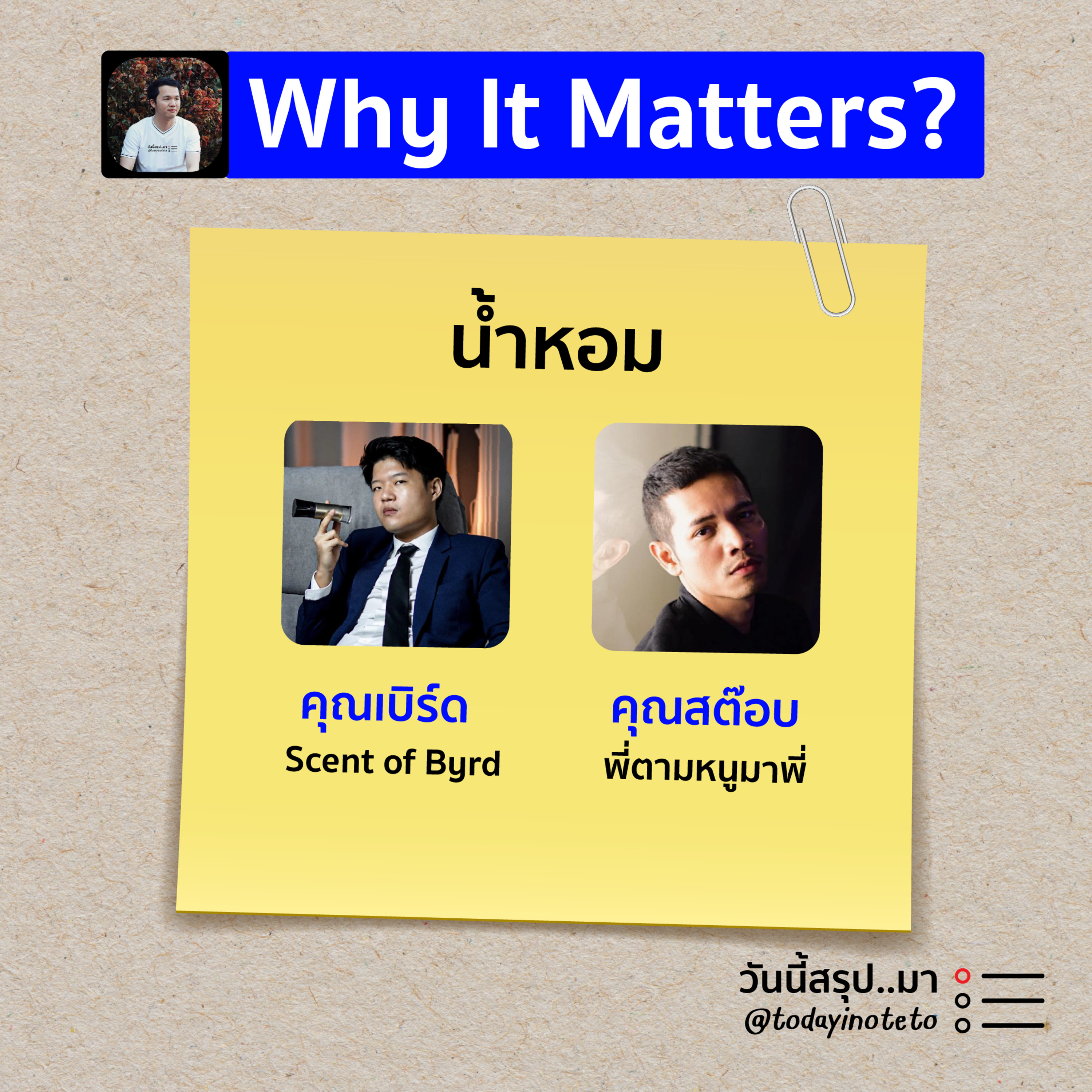 📝Why It Matters? ทำไม...ถึงสำคัญ “น้ำหอม” คืออะไร ทำไมถึงสำคัญ เหมาะกับใครบ้าง และถ้าอยากใช้ควรเริ่มยังไง มีวิธีในการเลือกอย่างไรบ้าง ร่วมพูดคุยกับ คุณเบิร์ด นักรีวิวน้ำหอมชื่อดัง เจ้าของเพจและรายการ Scent of Byrd และคุณสต๊อบ เจ้าของเพจ พี่หนูตามหนูมาพี่ | ดำเนินรายการโดย พี พนิต เจ้าของเพจ “วันนี้สรุป..มา”