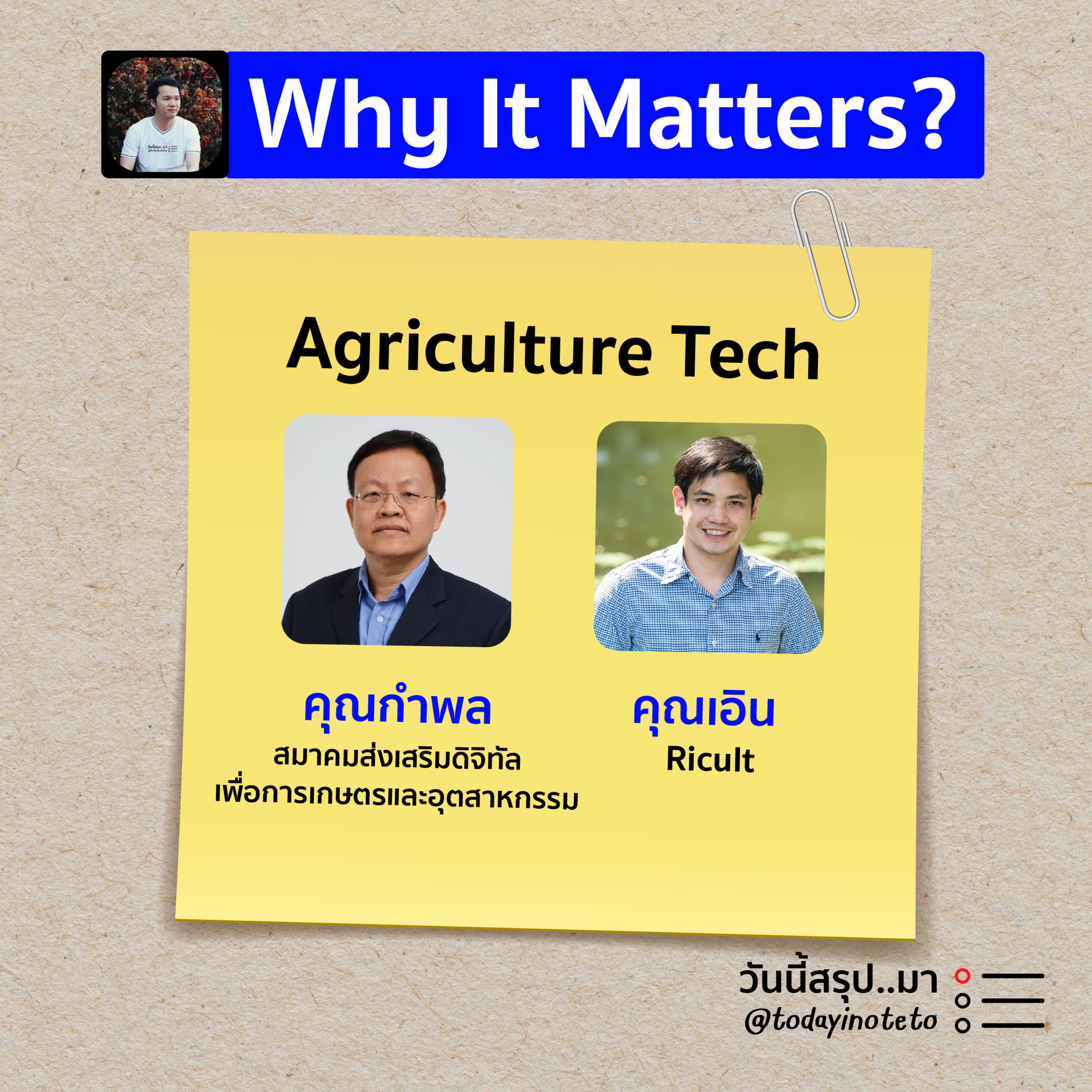 📝Why It Matters? ทำไม...ถึงสำคัญ “Agriculture Tech” คืออะไร ทำไมถึงสำคัญ เหมาะกับใครบ้าง และถ้าอยากเริ่ม ควรทำอย่างไร ร่วมพูดคุยกับ คุณกำพล นายกสมาคมส่งเสริมดิจิทัลเพื่อการเกษตรและอุตสาหกรรม (DPAI) และคุณเอิน CEO & Co-Founder of Ricult แอปพลิเคชั่นที่ให้ข้อมูลที่จำเป็นกับเกษตรกรในการวางแผนเพาะปลูกอย่างแม่นยำ | ดำเนินรายการโดย พี พนิต เจ้าของเพจ “วันนี้สรุป..มา”
