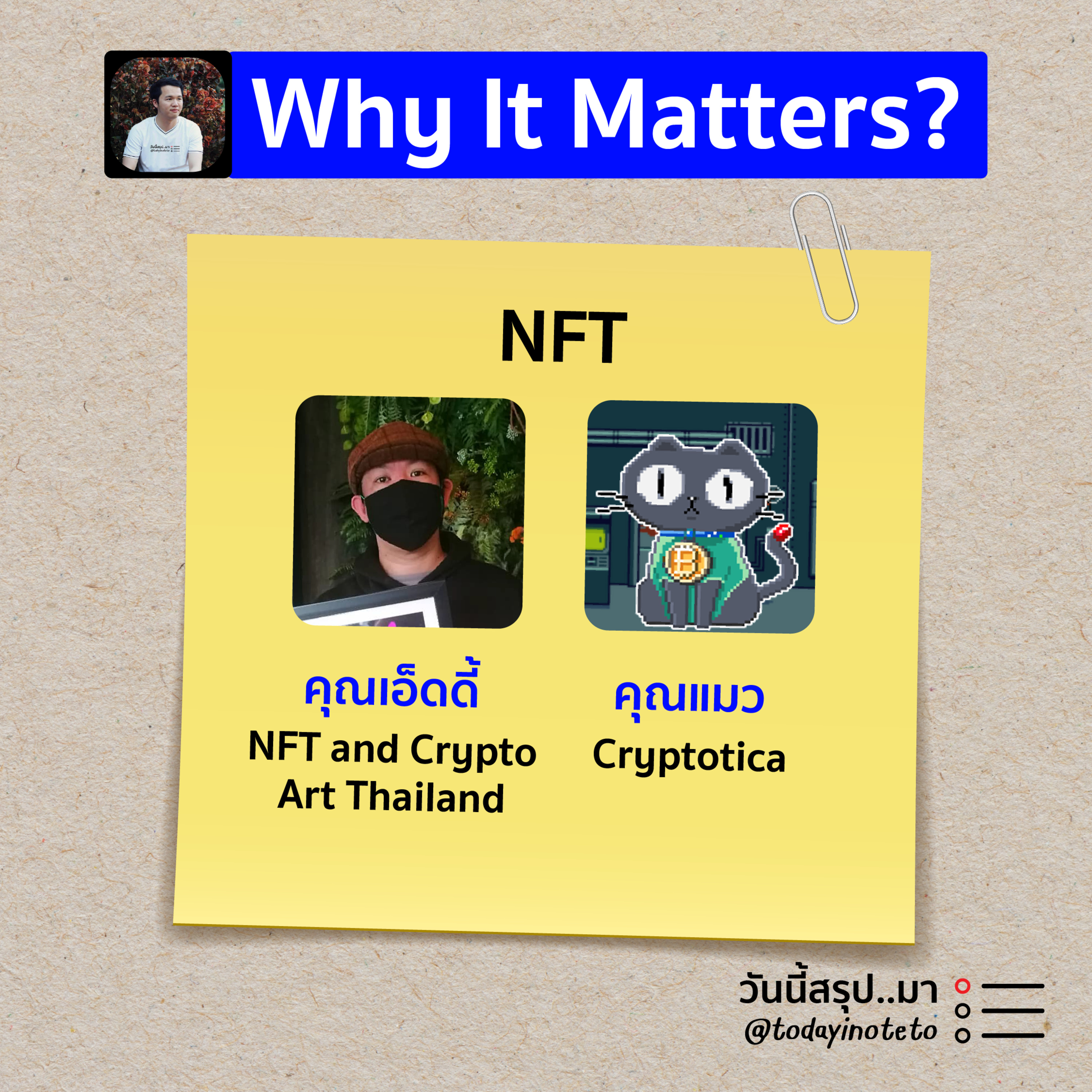 📝Why It Matters? ทำไม...ถึงสำคัญ “NFT” คืออะไร ทำไมถึงสำคัญ เหมาะกับใครบ้าง และถ้าอยากเริ่มศึกษา/ทำ ควรเริ่มอย่างไร ร่วมพูดคุยกับคุณเอ็ดดี้ Crypto Artist & NFT Investor ผู้ก่อตั้งกลุ่ม NFT and Crypto Art Thailand และคุณแมว เจ้าของเพจ Cryptotica| ดำเนินรายการโดย พี พนิต เจ้าของเพจ “วันนี้สรุป..มา"