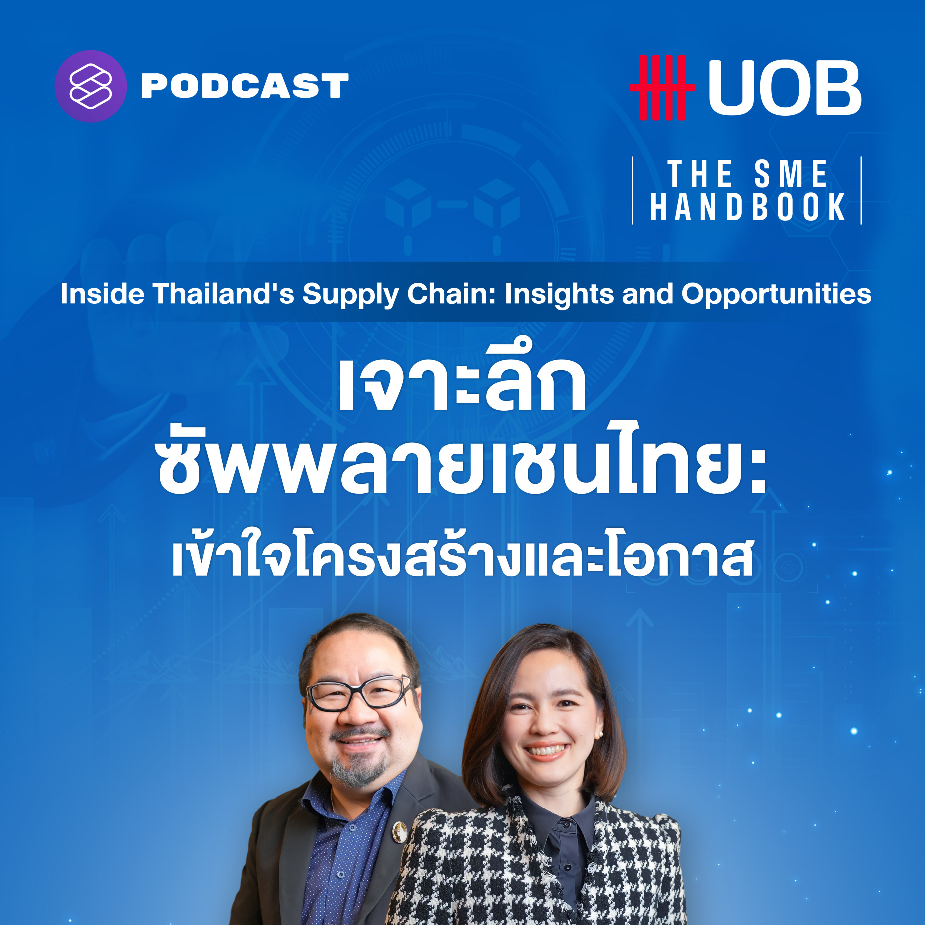 The SME Handbook by UOB เอพิโสดที่ 1 ของซีซัน 9 นี้ เฟิร์น-ศิรัถยา อิศรภักดี ชวน แสงชัย ธีรกุลวาณิช ประธานยุทธศาสตร์ สมาพันธ์เอสเอ็มอีไทย มาพูดคุยเพื่อทำความเข้าใจโครงสร้างของซัพพลายเชนในประเทศไทย และชี้ให้เห็นถึงความท้าทายและโอกาสที่ SME ไทยต้องรู้