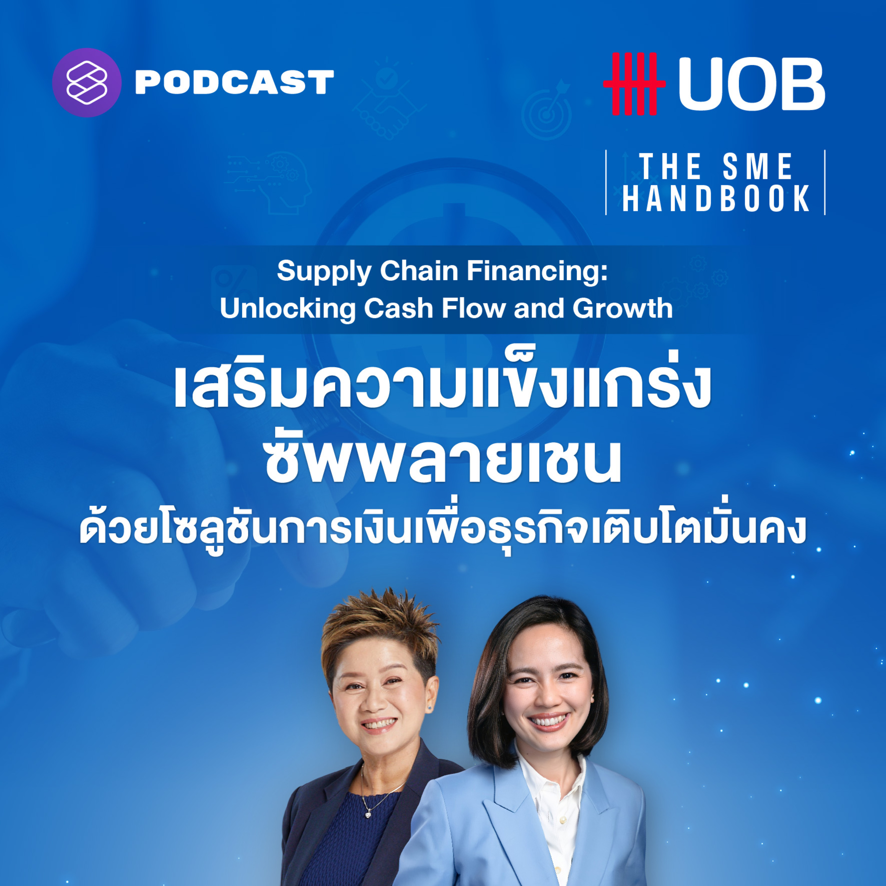 THE SME HANDBOOK by UOB เอพิโสดที่ 6 ของซีซัน 9 นี้ เฟิร์น-ศิรัถยา อิศรภักดี พาไปเจาะลึกกับ สยุมรัตน์ มาระเนตร Executive Director, Head of Business Banking ธนาคารยูโอบี ประเทศไทย ถึงกลยุทธ์การบริหารสภาพคล่อง และการเข้าถึงแหล่งเงินทุนที่เหมาะกับวัตถุประสงค์ที่ SME ต้องรู้ พร้อมเปิดมุมมองใหม่ว่า “โซลูชันทางการเงินที่เข้าใจซัพพลายเชน” คือกุญแจสำคัญในการเสริมความแข็งแกร่งให้ธุรกิจเติบโตอย่างมั่นคง