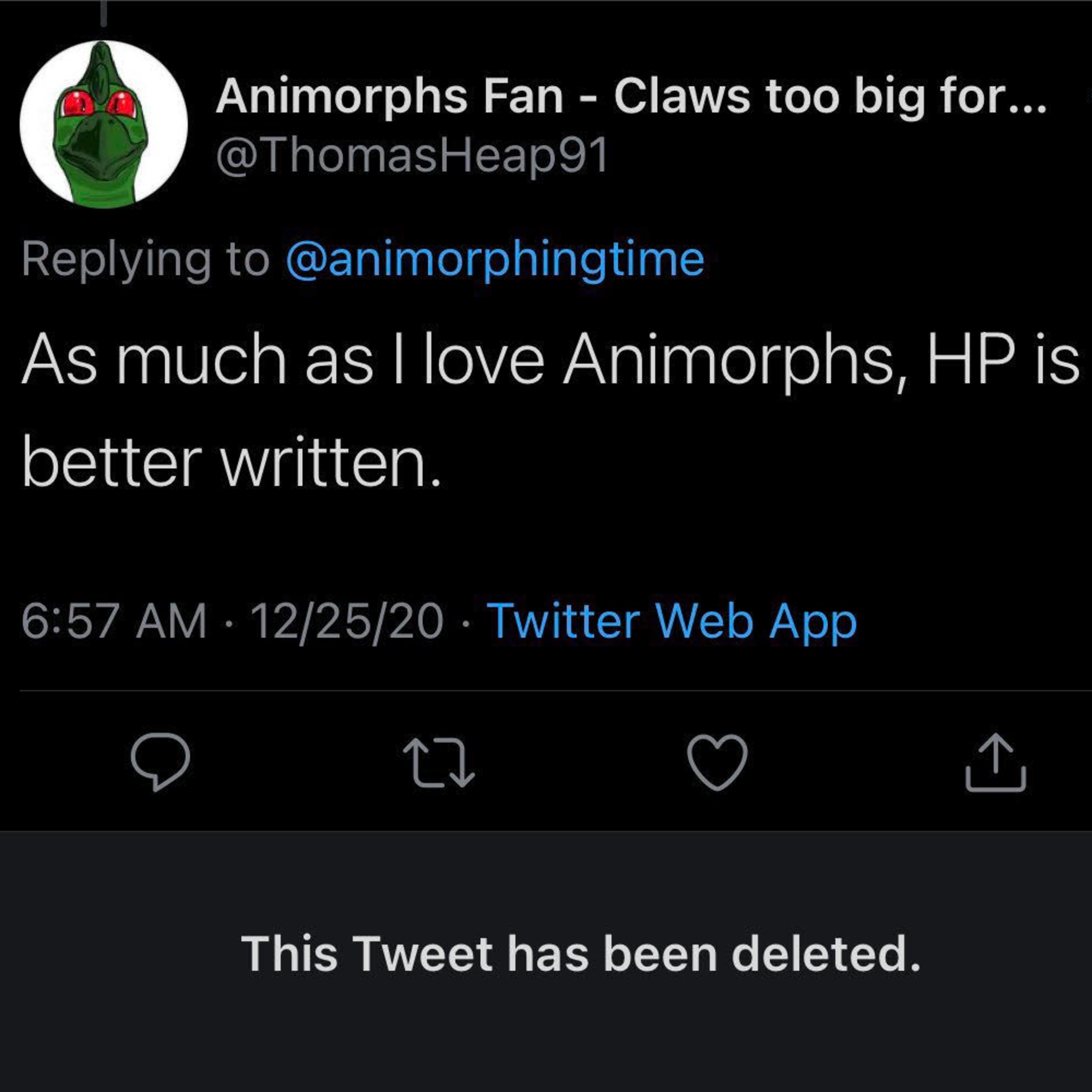 He’s the Animorphs YouTuber that makes right wing content about Animorphs. He runs a large Animorphs discord where he allowed a Nazi to be a mod. He thinks animorphs is too woke. And he also thinks jk Rowling is a better writer than KA Applegate.