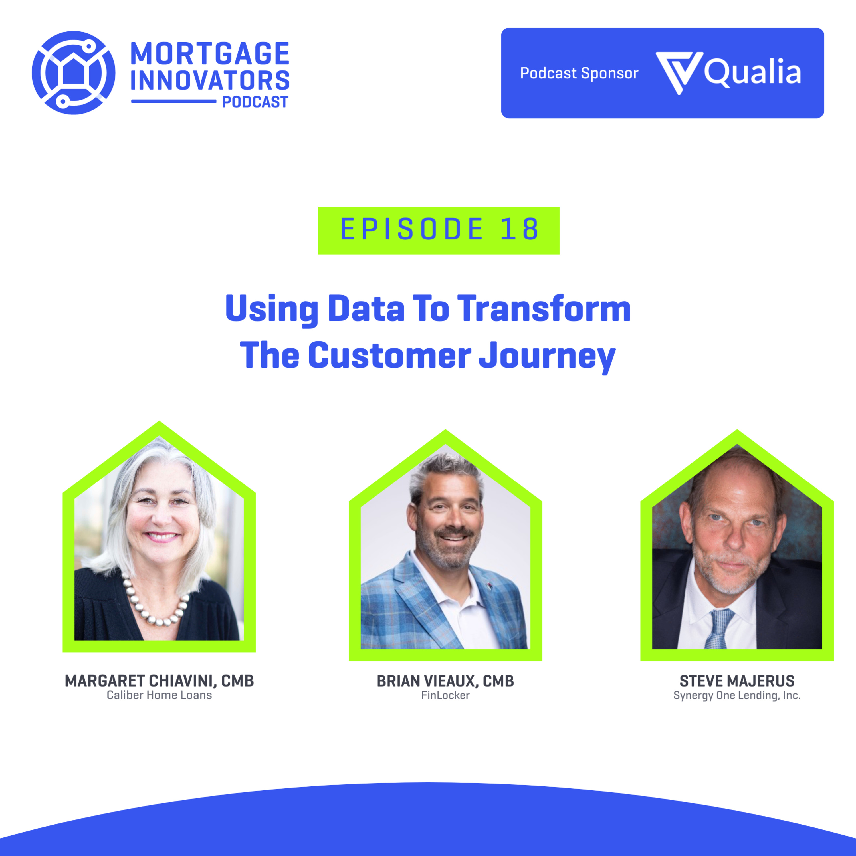 In our 18th episode, we replay a great session that was premiered at this year's virtual Mortgage Innovators Conference. Join Margaret moderate a panel entitled "Using Data To Transform the Customer Journey". She is joined by industry veterans Brian Vieaux, CMB and Steve Majerus, Synergy One Lending, Inc.