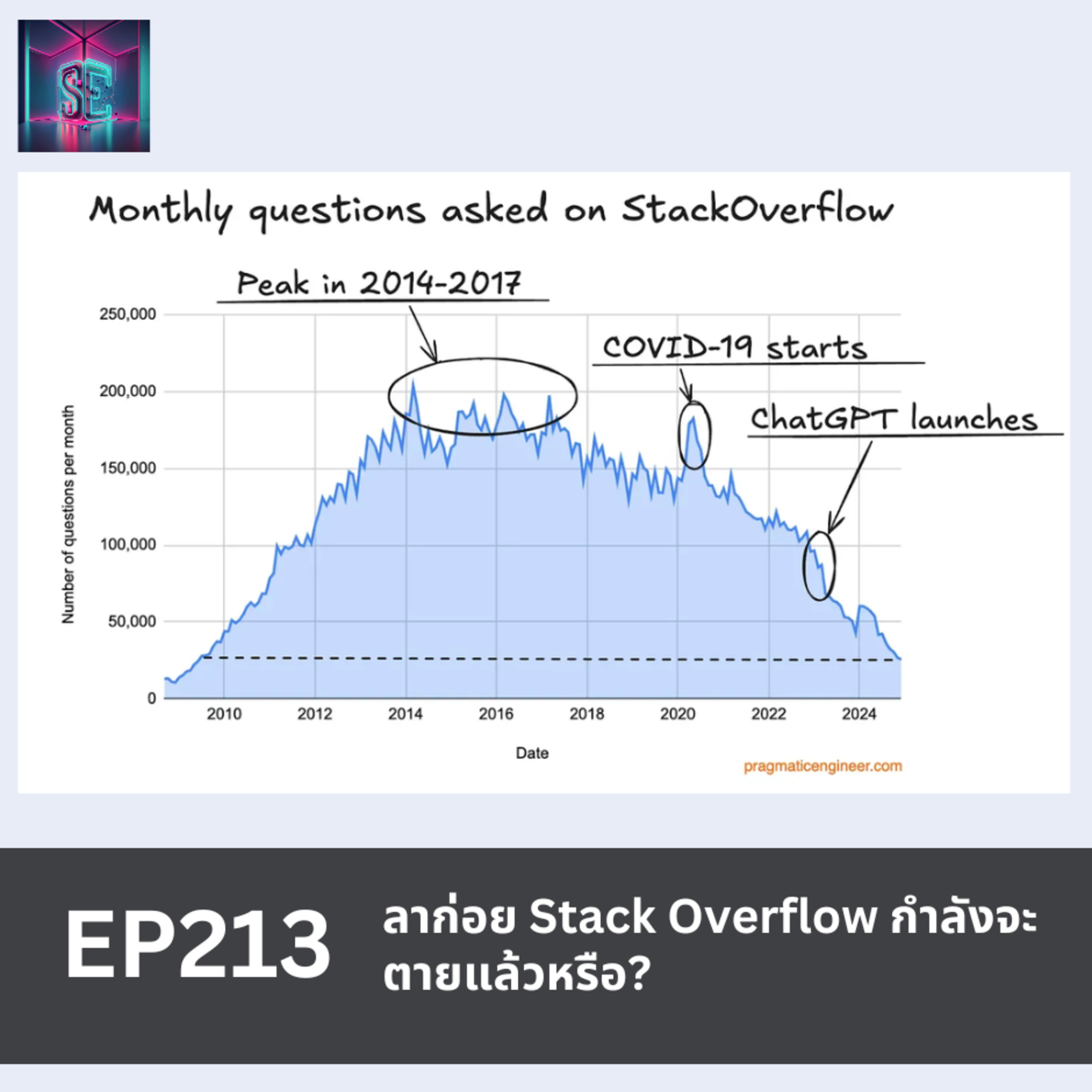 EP นี้ชวนคุยเรื่อง Stack Overflow เว็บไซต์ขวัญใจโปรแกรมเมอร์รุ่นใหญ่ที่ใช้กันมาอย่างยาวนาน สถิติ ณ ปัจจุบันทำให้เห็นว่า Stack Overflow มีคนใช้งานลดลงมากอย่างน่าใจหาย สาเหตุอาจจะเพราะการมาของ GenAI ที่ช่วยโปรแกรมเมอร์โค้ดได้เก่งมากๆ หรือมีปัจจัยอื่นๆ ร่วมด้วย ไปคุยกันใน EP นี้ครับ