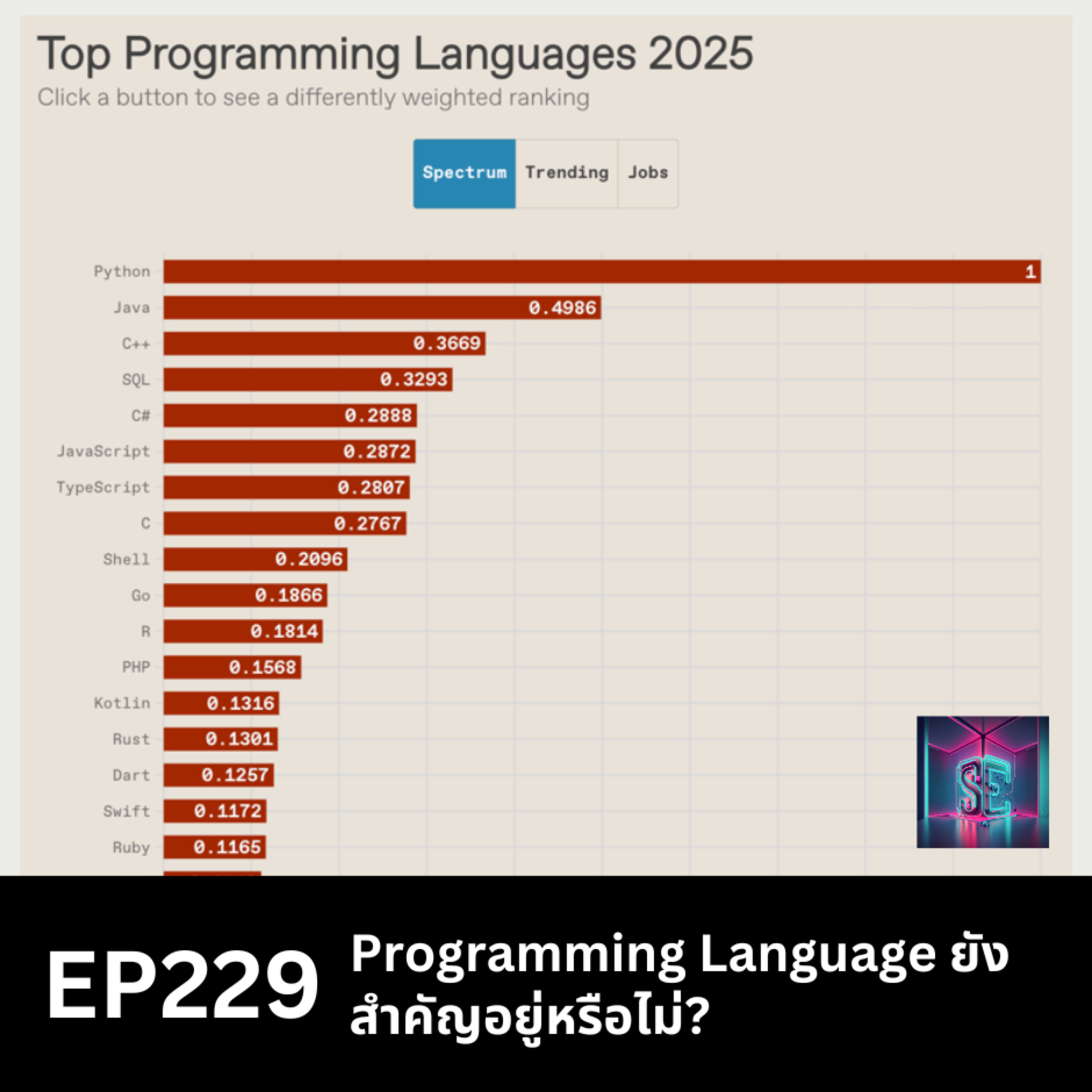 EP นี้เอา IEEE Spectrum Top Programming Languages 2025 มาสรุปให้ฟังกันครับ แต่แทนที่จะดู ranking กันเป็นหลัก EP นี้ชวนให้คิดกันว่าการจัดอันดับ programming language หรือแม้แต่ programming language ใดๆ นั้น ยังจำเป็นอยู่หรือไม่ ในยุคแห่ง AI Coding Agent แบบตอนนี้ ไปฟังกันใน EP นี้ครับ