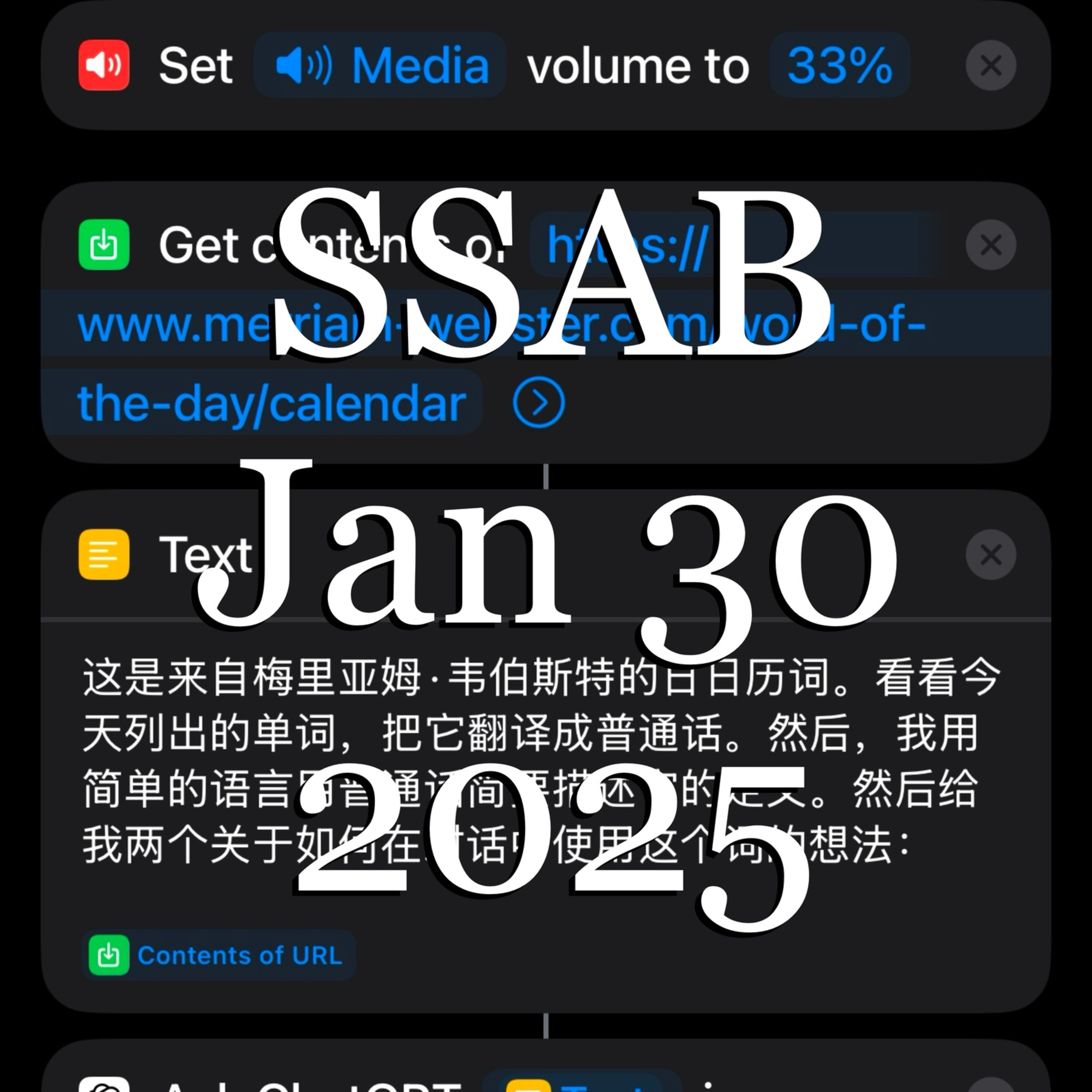 Word of the Day from Merriam-Webster calendar translated INTO CHINESE, put into a NOTE, and then… SPOKEN IN CHINESE and saved in a particular folder!