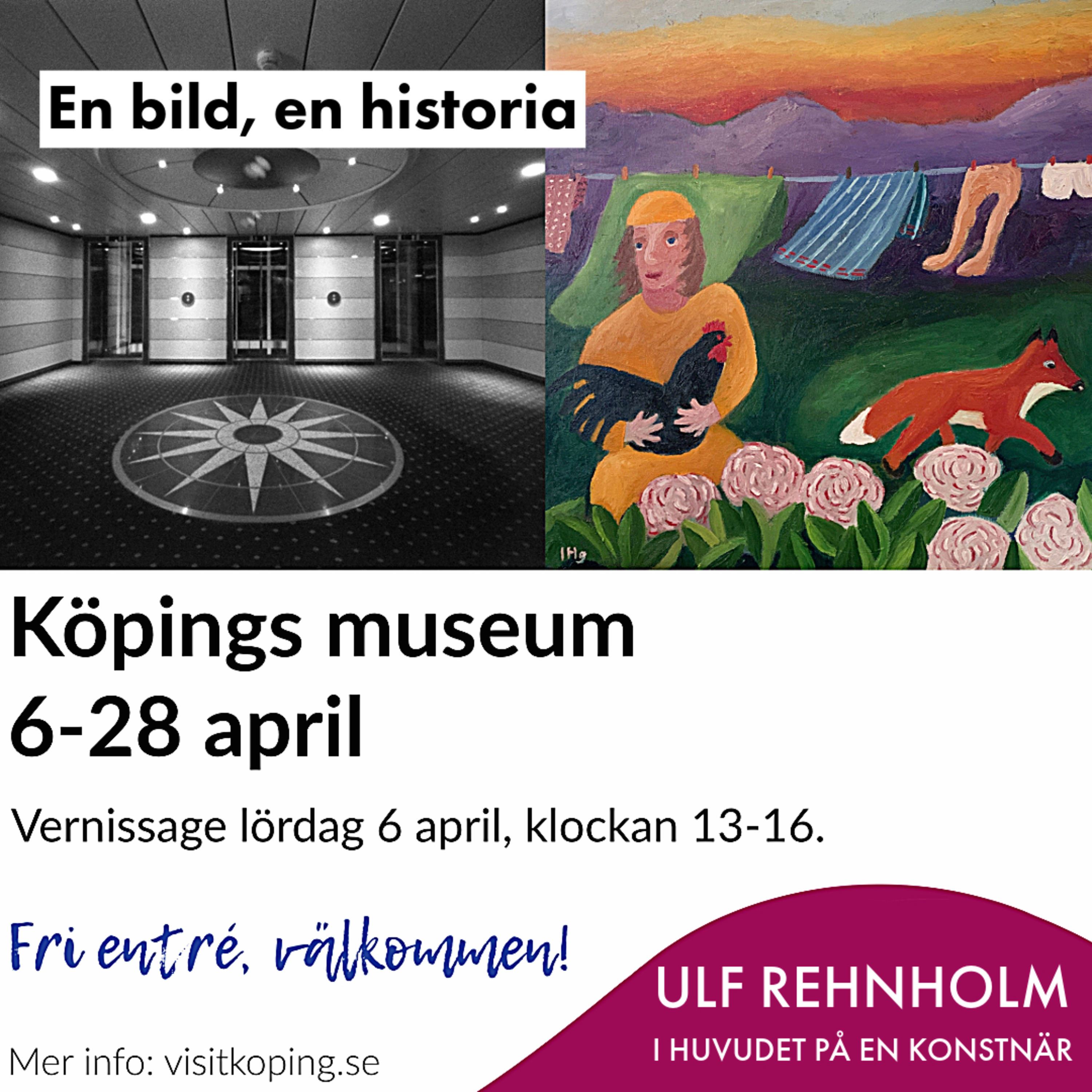 Här berättar jag om bakgrunden till utställningen En bild, en historia, som visades på Köpings museum våren 2024. Det var Inger Holmbergs idé att vi skulle göra en utställning ihop, där mina svartvita bilder skulle kunna bli en spännande motpol till hennes färgstarka naivistiska målningar.