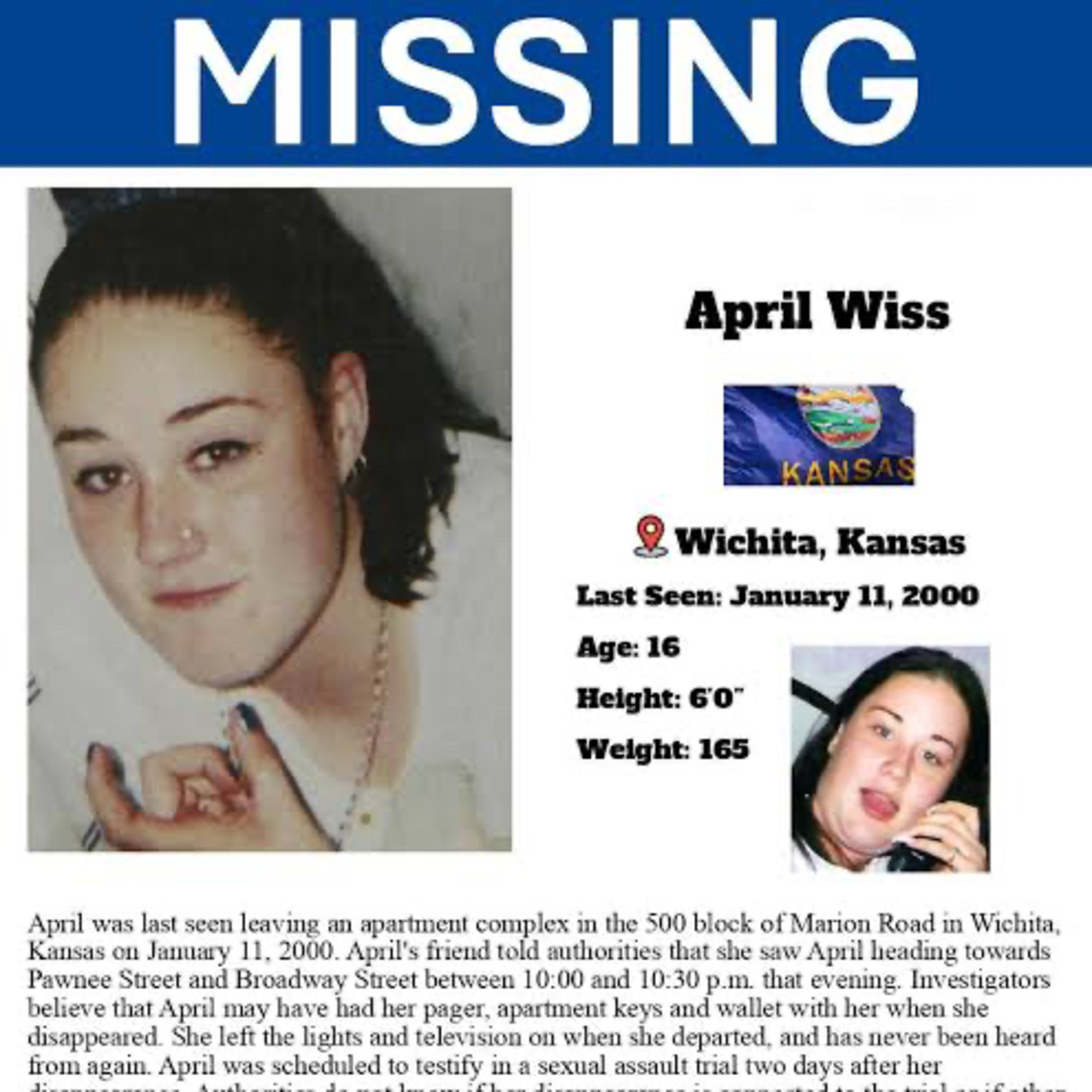 16 year old April Wiss baked a cake and then left her Wichita apartment with only her keys, pager & wallet on January 11, 2000.