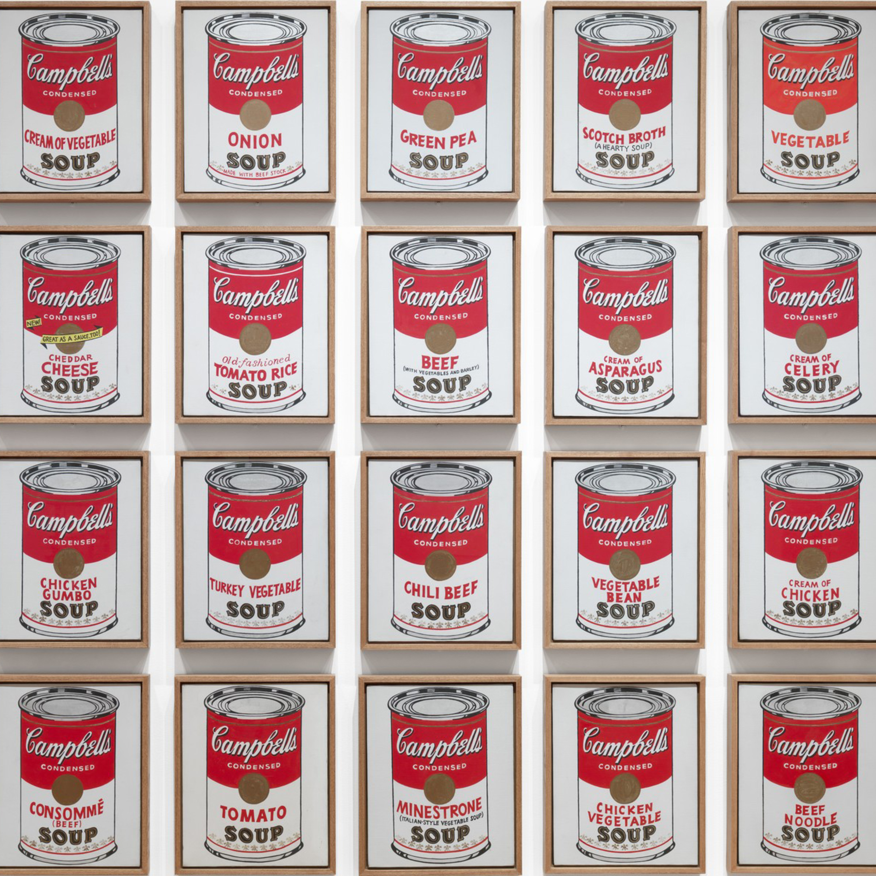 Andy Warhol’s 32 Campbell’s Soup Cans have become a canonical symbol of American Pop Art. Warhol, an American commercial illustrator from Pittsburgh, Pennsylvania turned fine artist, author, publisher, painter, and film director, first showed the work on July 9, 1962 in the Ferus Gallery in Los Angeles, California. It was his first solo exhibition.