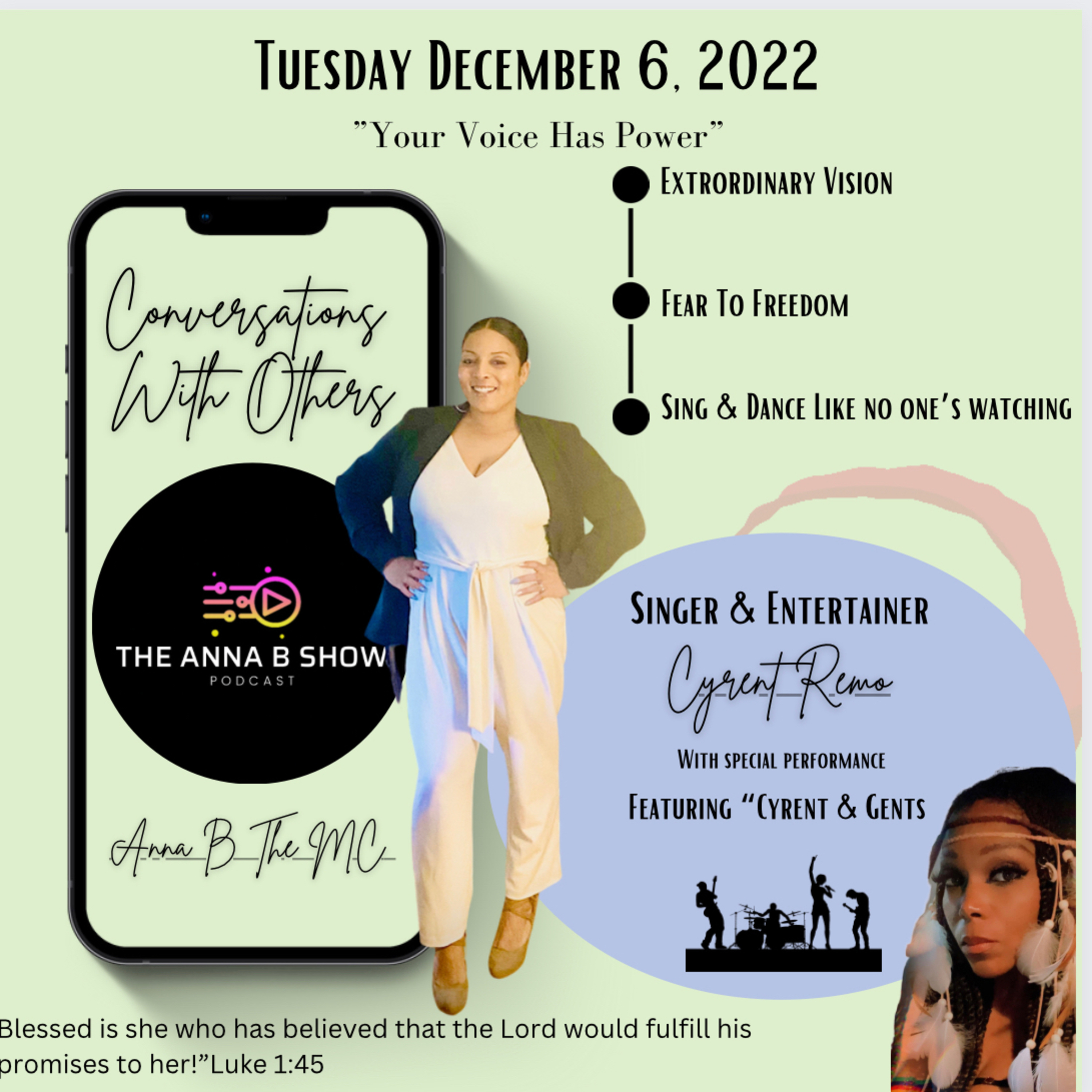 ☑️ Sing & Dance Like No One’s Watching- Sit back and enjoy some entertainment and fun as Cyrent and her amazing band share their gift of music 🎶 !!! I am truly excited about this episode!! We will have a fun chat about the power of music and the good times had when we come together to “sing & dance like no one’s watching!” 💃🏽 🎶 🕺🏽
