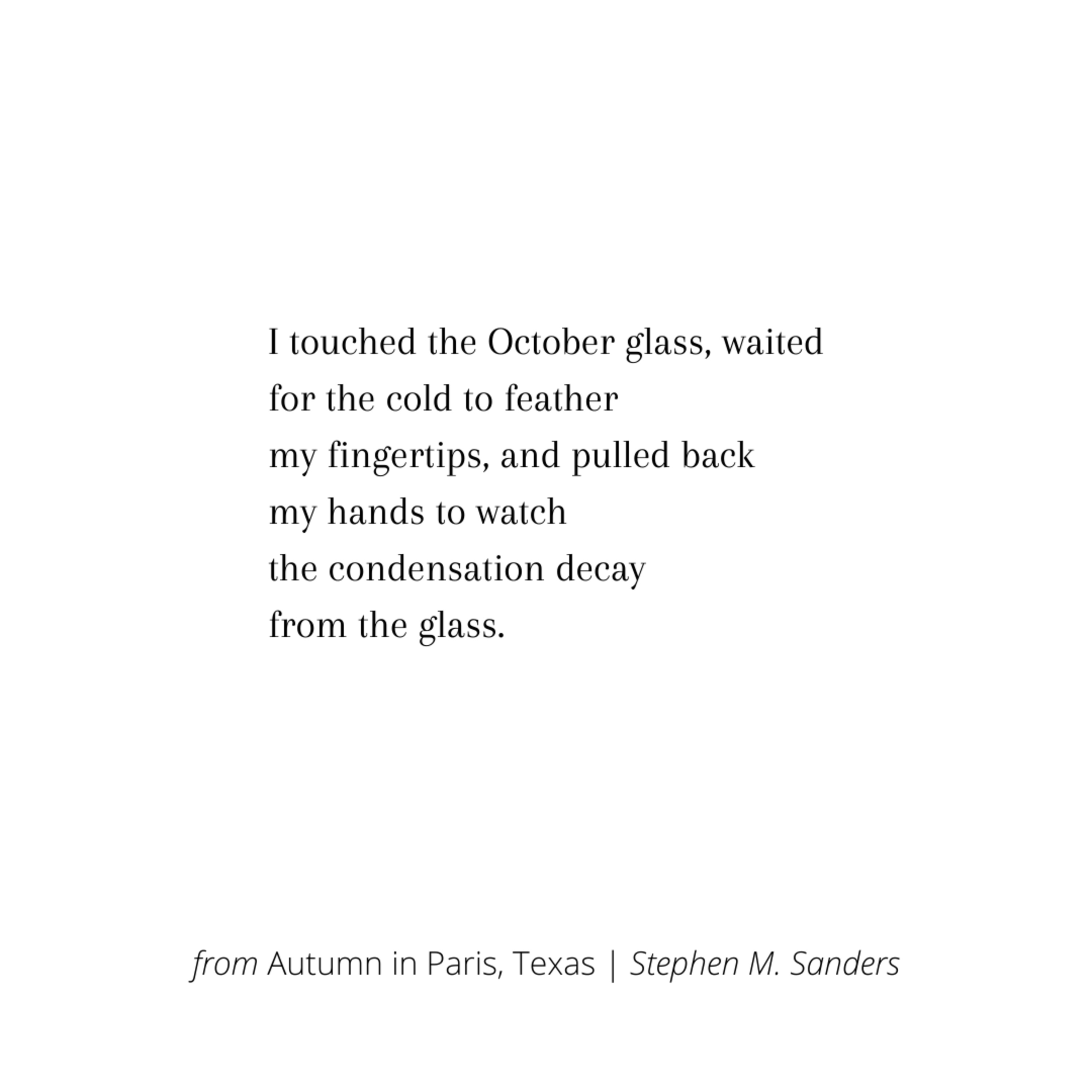 Stephen M. Sanders is an assistant professor of English at South Plains College in Levelland, Texas. He has had poems included in publications including Pacifica Literary Review, Penumbra Literary & Art Magazine, and the Austin International Poetry Festival di-vêrsé-city anthology. His first novel Passe-Partout was published in 2019 (Monument Place Books).