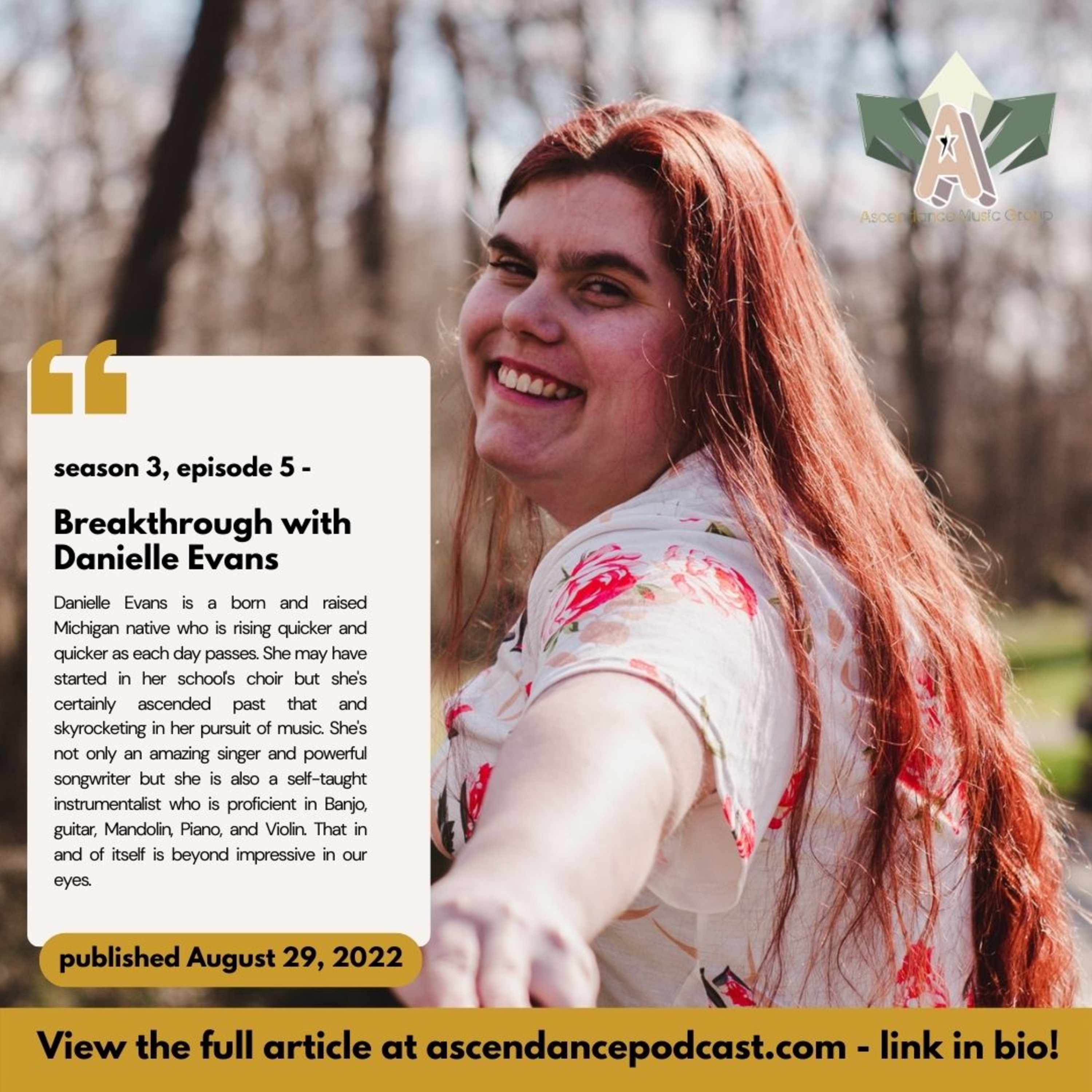 Danielle Evans is a born and raised Michigan native who is rising quicker and quicker as each day passes. She may have started in her school's choir but she's certainly ascended past that and skyrocketing in her pursuit of music. She's not only an amazing singer and powerful songwriter but she is also a self-taught instrumentalist who is proficient in Banjo, guitar, Mandolin, Piano, and Violin. That in and of itself is beyond impressive in our eyes.