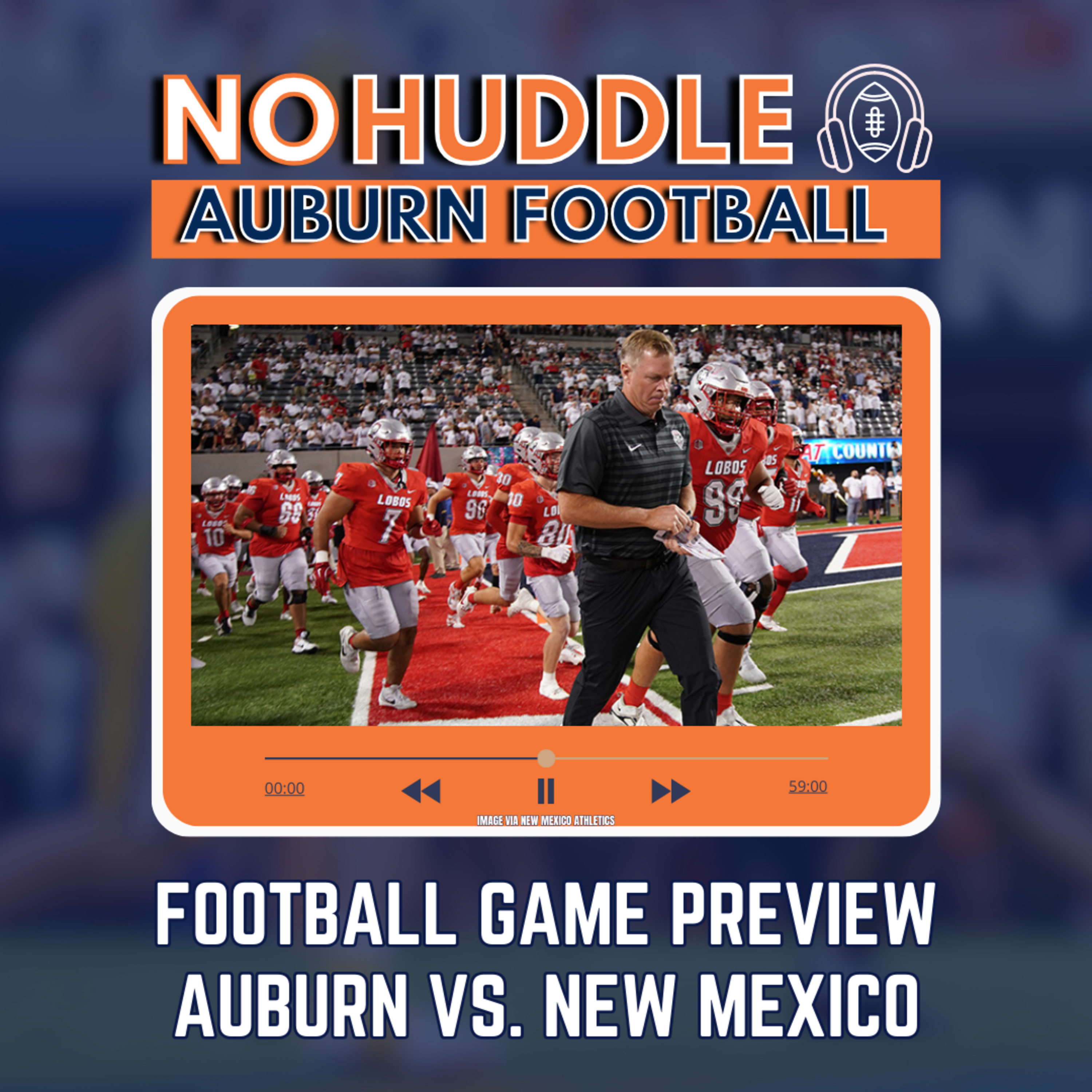 Auburn football podcast with co-hosts AJ Richardson and Jared Davis. The main discussion covers a preview of the 2024 game vs. New Mexico.