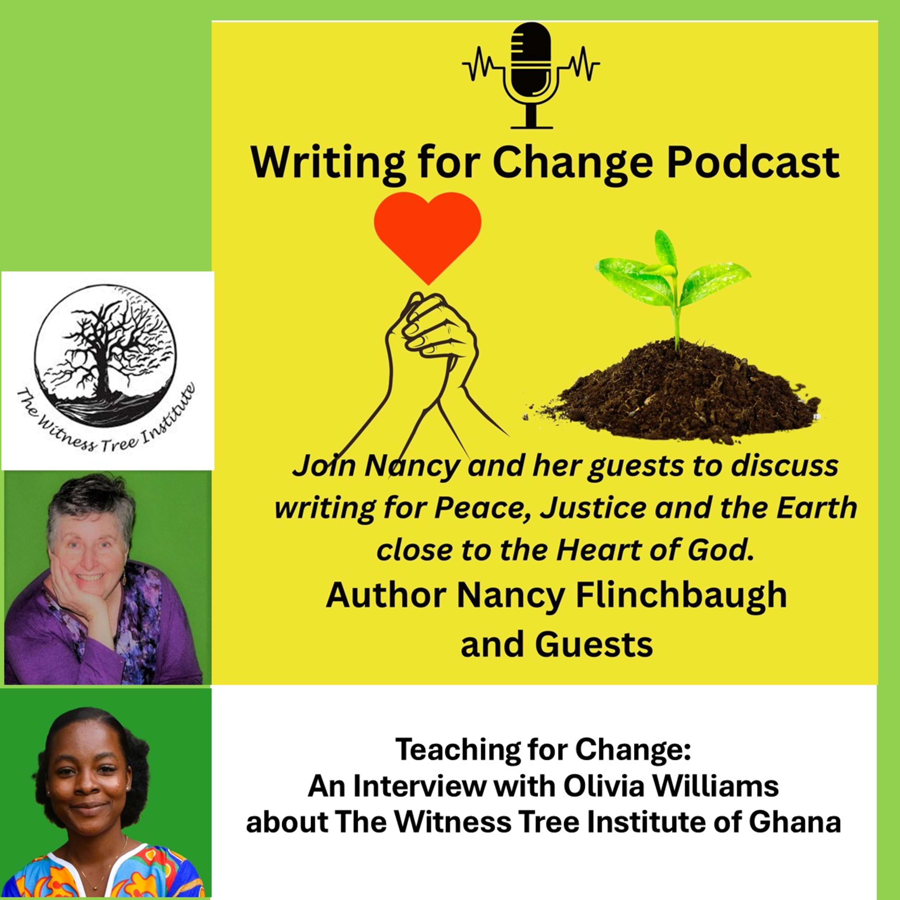 In this podcast, Author Nancy Flinchbaugh interviews Ghanaian teacher, Olivia Williams, about her experiences with the Witness Tree Institute of Ghana summer program. She talks about how what she learned helps her in her teaching. Olivia teaches grades 7-9 in English Language and Creative Arts in Ghana. She is also an artist and dance instructor. The Witness Tree Institute provides a two week transformative education experience for teachers in Ghana where they learn about the culture and history of Ghana. Find out more on their website at: witnesstreeinstitute.org. You can email Olivia at williams2000ov@gmail.com